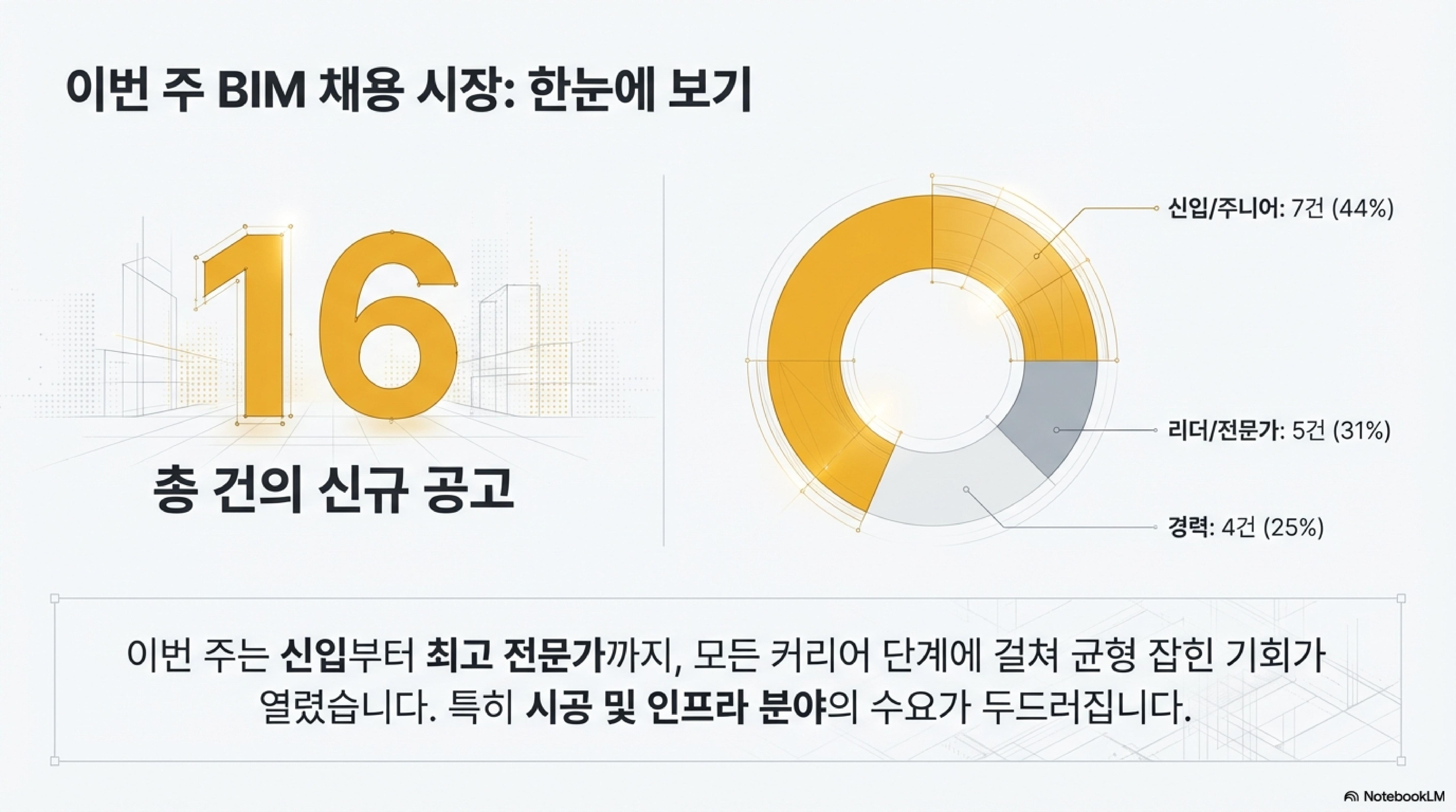 이번 주 구인 시장의 가장 큰 특징은 'BIM 적용 분야의 다각화'입니다. 과거 건축 설계 사무소 위주였던 채용이 이제는 시공, 엔지니어링, 심지어 소프트웨어 개발사로까지 넓어졌습니다.