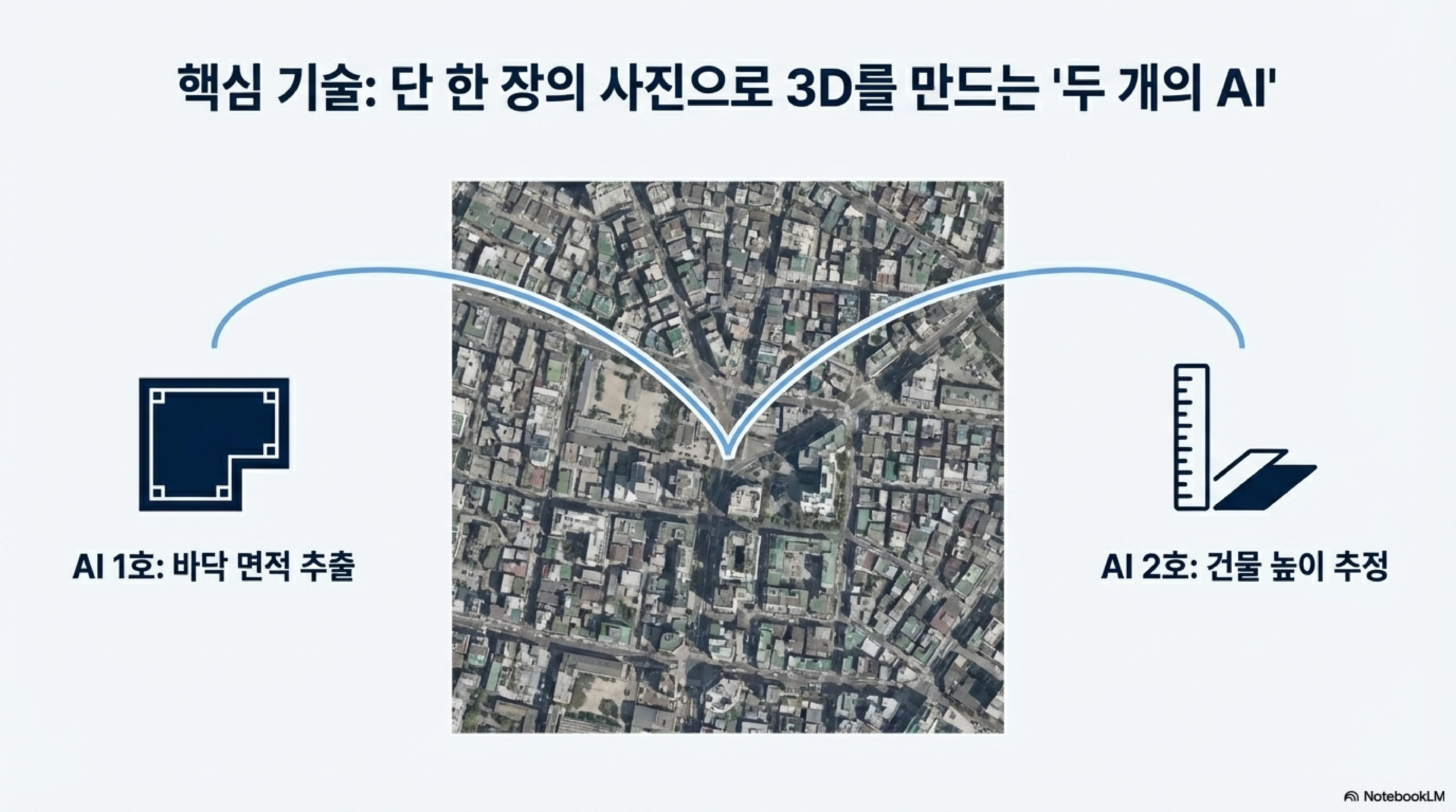 이 프로젝트의 기술적 성과는 단 한 장의 평면 위성 사진으로 건물의 입체적 높이를 계산하는 '단안 높이 추정' 기술에 있다. 이를 위해 두 개의 고도로 전문화된 AI 시스템이 유기적으로 작동한다.