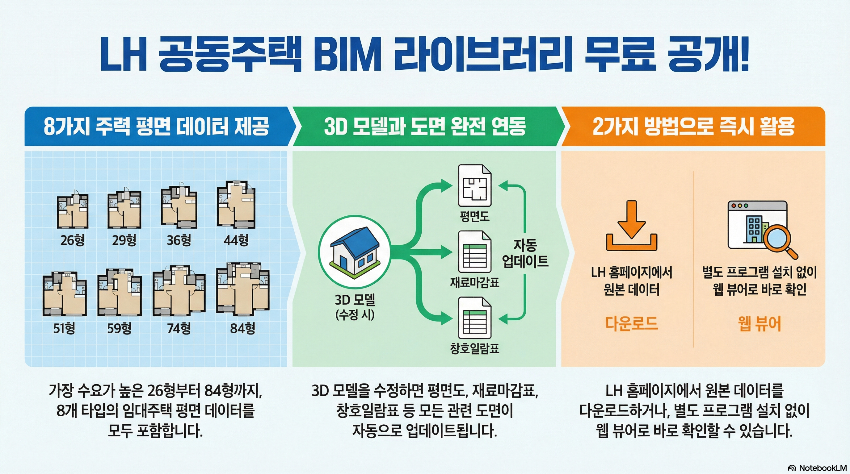 한국토지주택공사(LH)는 공동주택 주력 평면 8개 타입에 대한 BIM(빌딩 정보 모델링) 라이브러리를 공개했다. 이 라이브러리는 3D 모델(구조, 건축 마감)과 관련 도면 일체를 포함하는 포괄적인 데이터 세트로 구성되어 있으며, 설계 및 시공 과정의 효율성을 높이는 것을 목표로 한다.