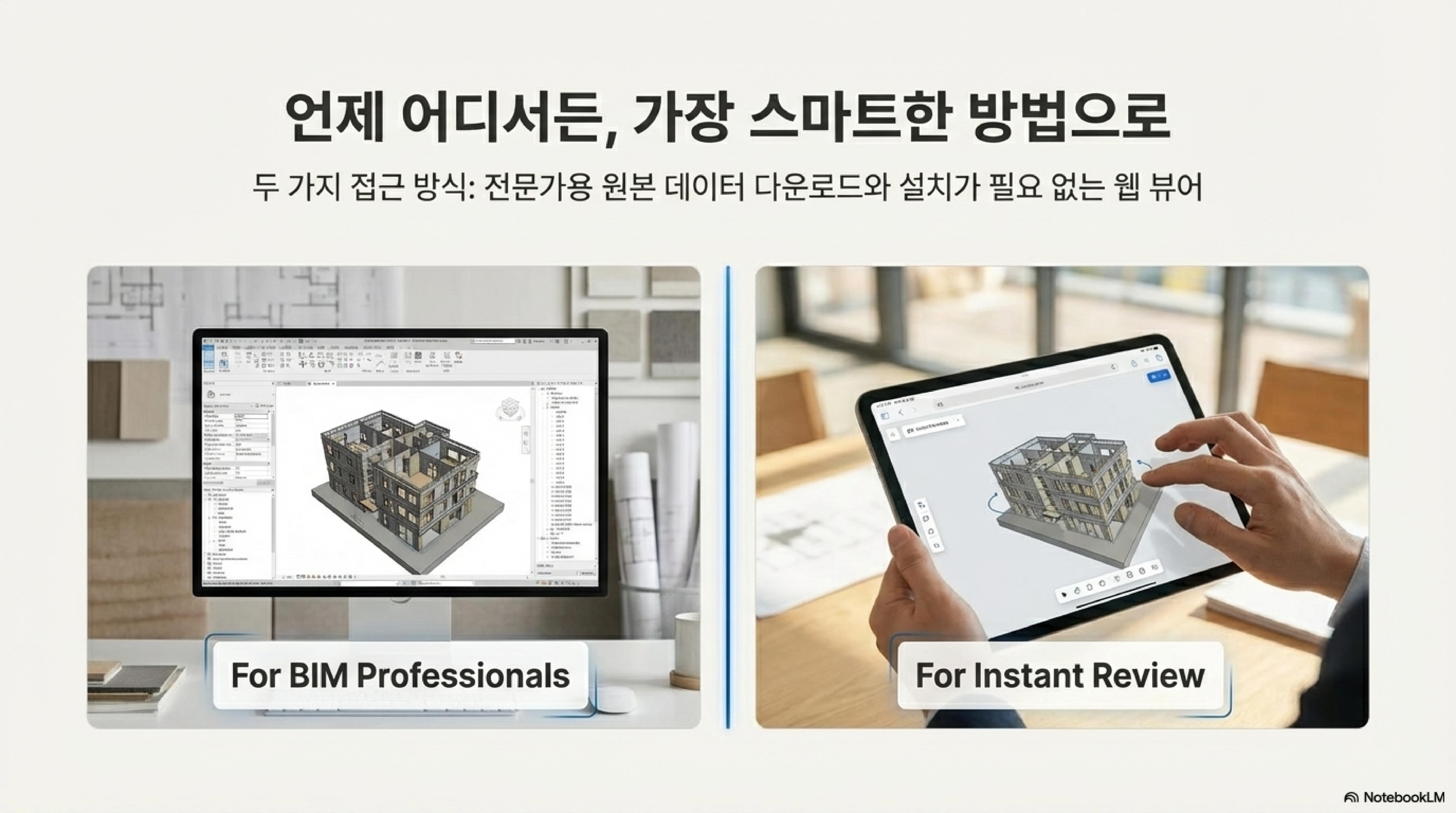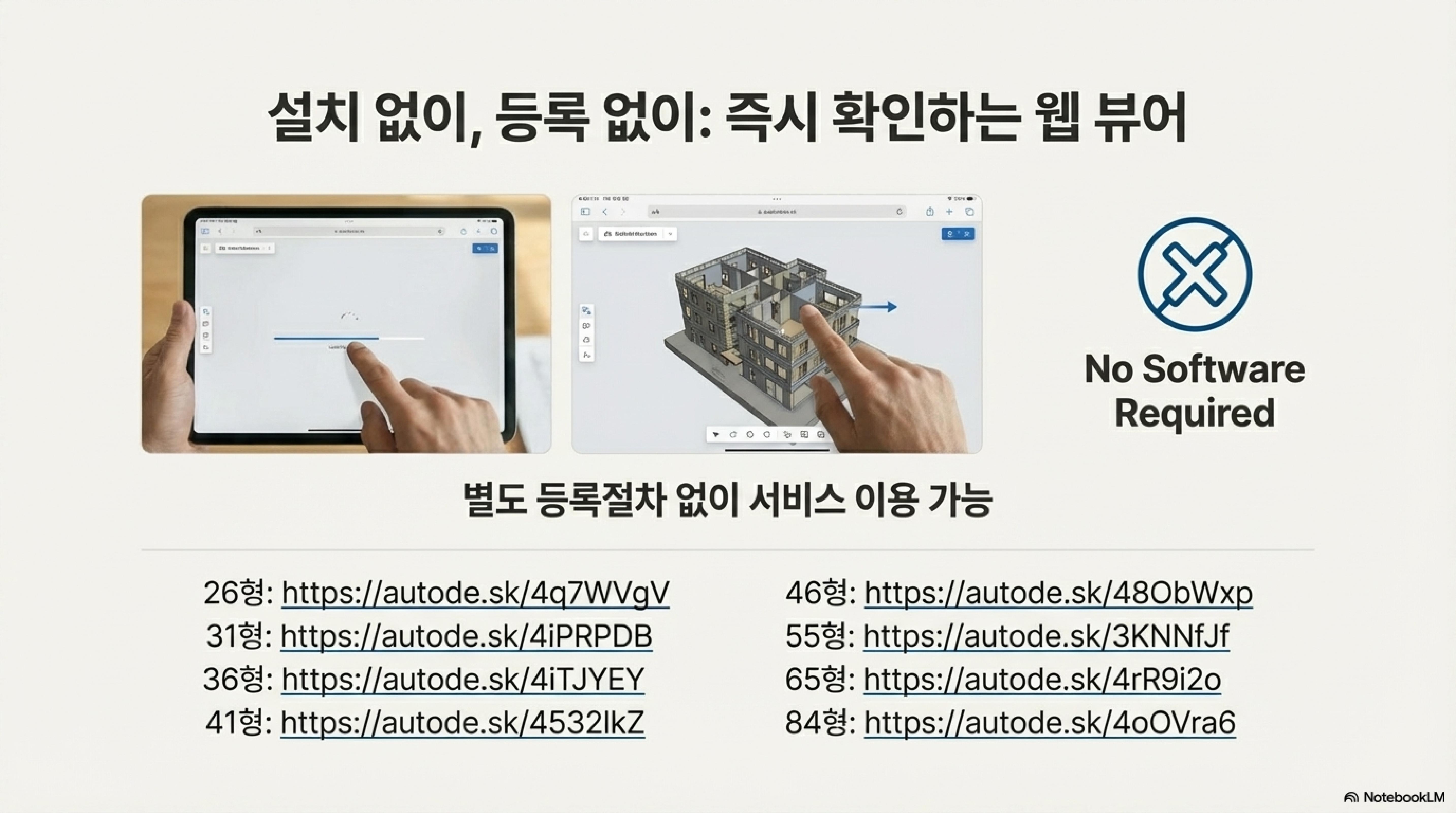 BIM 소프트웨어가 설치되지 않은 사용자를 위해, 별도의 등록 절차 없이 웹 브라우저를 통해 3D 모델을 확인할 수 있는 웹 뷰어 링크를 제공한다.