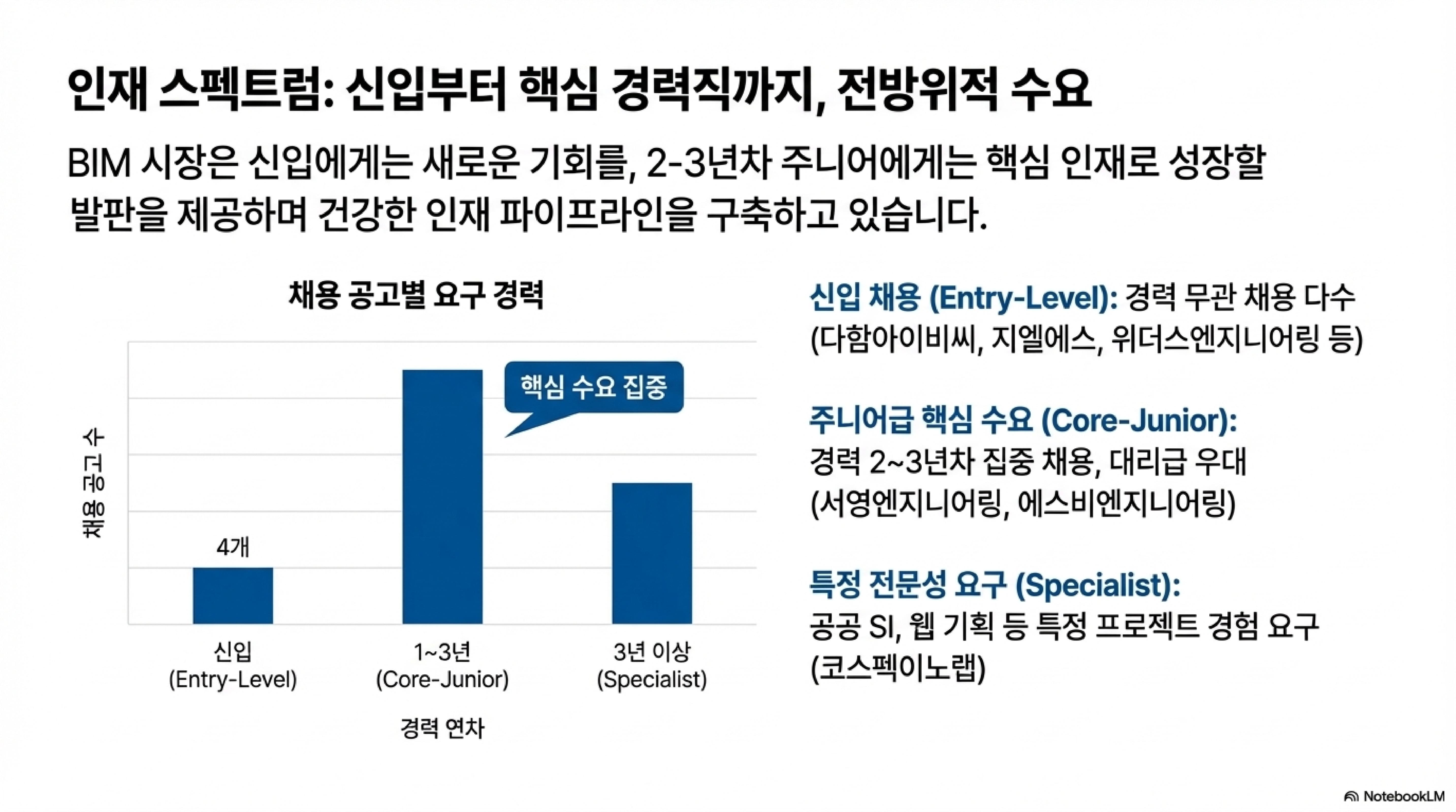 특히 눈에 띄는 점은 요구하는 경력 스펙트럼이 매우 넓어졌다는 거예요. 신입부터 2년 이상의 실무자, 그리고 3년 이상의 숙련된 경력직까지 전방위적인 채용이 이뤄지고 있습니다. 이건 BIM 시장이 일시적인 유행을 넘어 안정적인 생태계를 형성했다는 아주 명확한 신호죠.