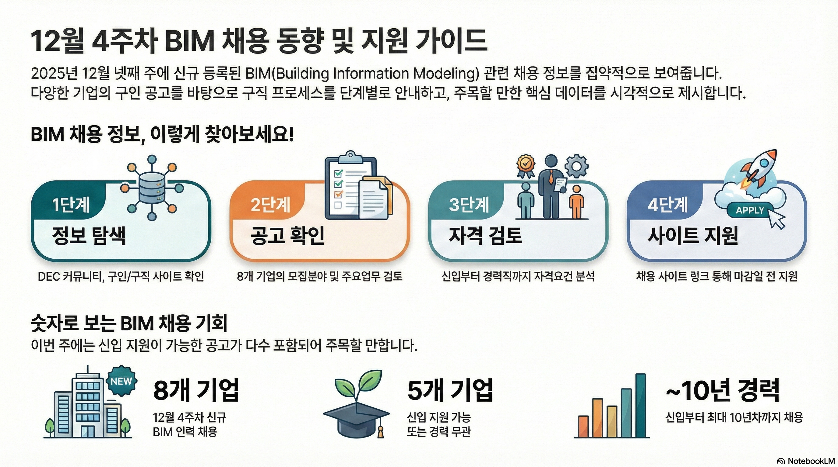2025년 12월 4주차 구인정보를 알려드립니다.12월22일 ~ 12월26일 까지 신규 등록된 구인공고 리스트 입니다. BIM 구인/구직 서비스 사이트: https://job.dec-w.com/사람인, 잡코리아 등의 구직사이트에 올라