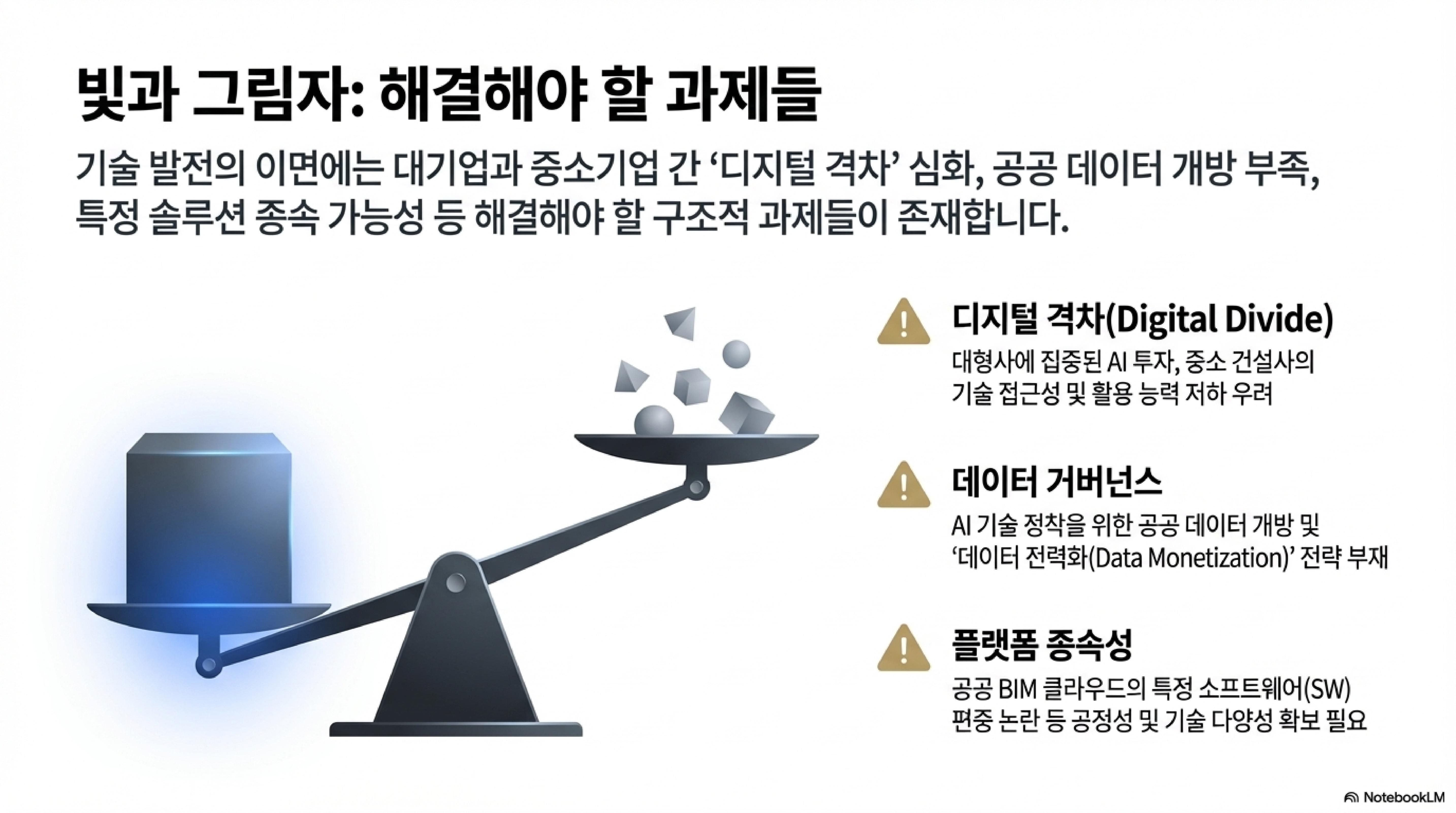 - 대·중소기업 간 '디지털 격차': AI 및 첨단 스마트 건설 기술 도입에는 상당한 초기 투자가 요구된다. 이로 인해 기술 투자 여력이 있는 일부 대형 건설사와 자금 및 정보가 부족한 중소 업체 간의 기술 격차가 심화되고 있다. "AI 도입은 일부 대형사만…벌어지는 건설업 기술 격차"라는 지적은 이러한 현실을 단적으로 보여준다.