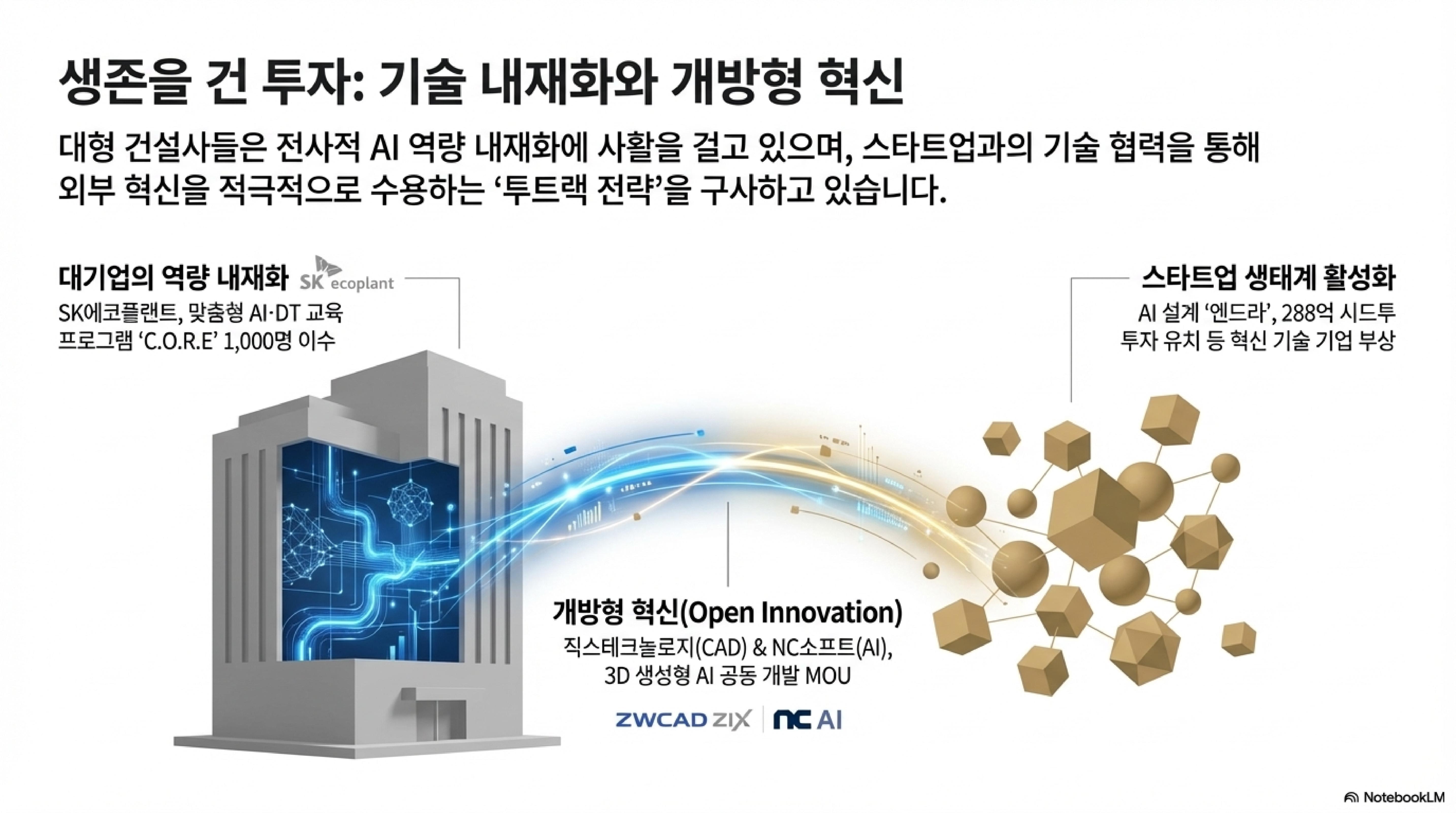 - 미래 인재 양성을 위한 교육계의 변화: 중앙대학교 등 다수 대학이 스마트건축 및 AI 관련 학과를 신설했으며, SK에코플랜트는 자체 AI·DT 교육 프로그램인 **'C.O.R.E'**를 통해 단기간에 1,000명의 이수자를 배출했다.