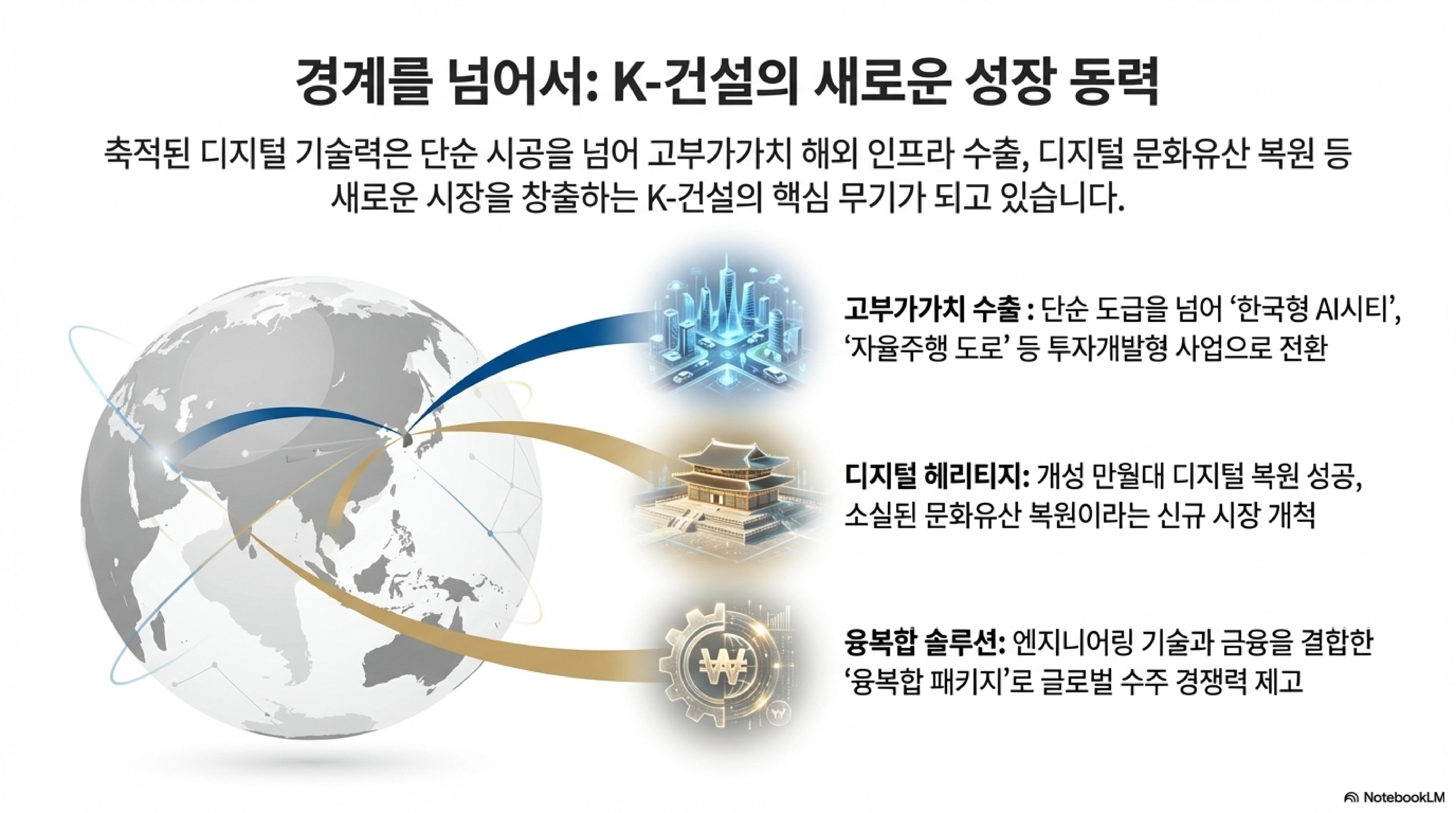 - 디지털 헤리티지: **'개성 만월대'**를 BIM과 VR로 복원한 사례는 건설 기술이 문화유산 보존이라는 새로운 시장을 창출하고 교육 및 관광 콘텐츠로서의 가치를 만들어낼 수 있음을 보여준다.