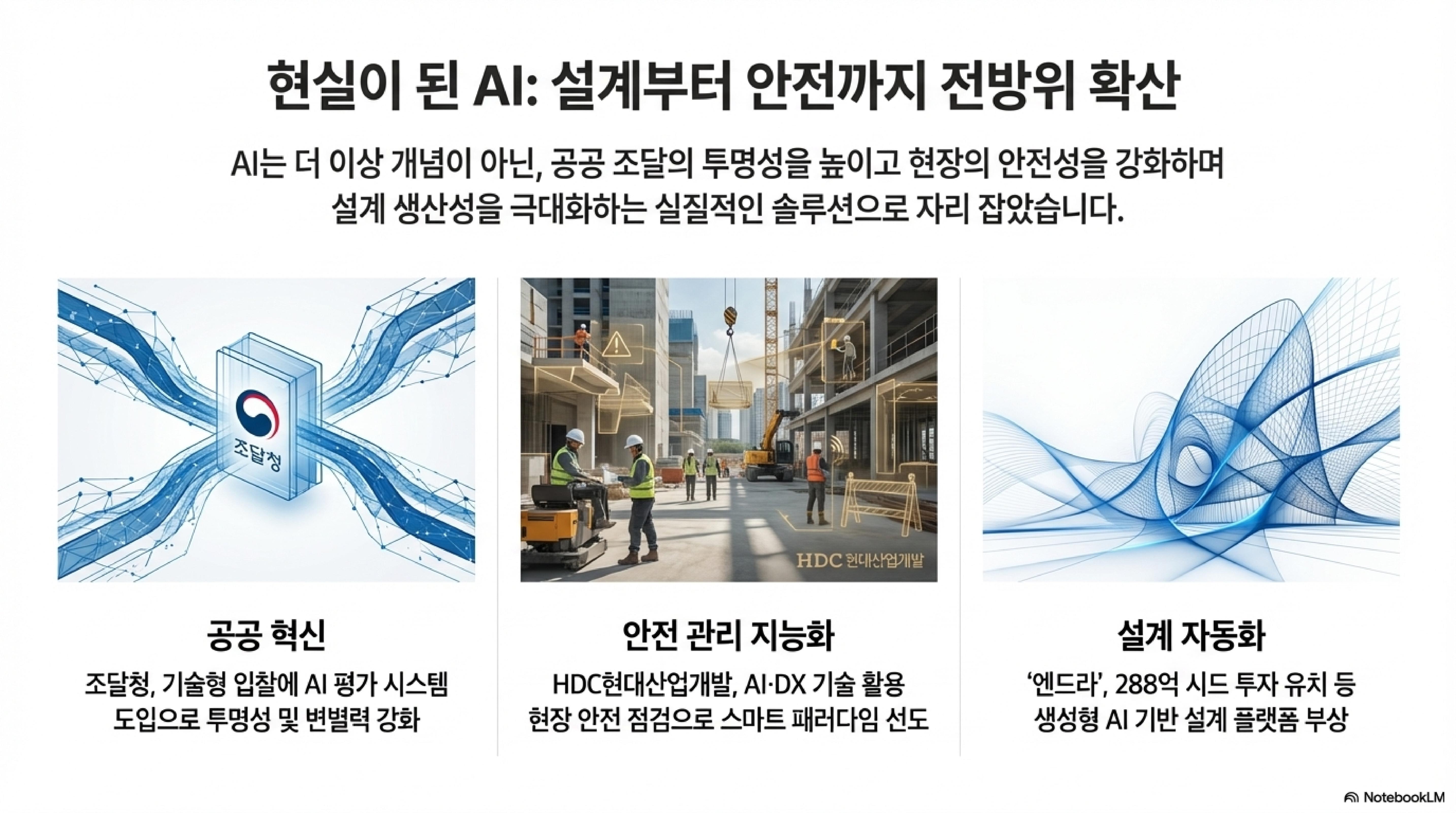 - 이는 AI가 단편적인 효율 개선을 넘어, 공공 조달의 공정성 확보와 현장의 중대재해 예방이라는 산업의 핵심 난제 해결에 직접적으로 기여하기 시작했음을 의미한다.