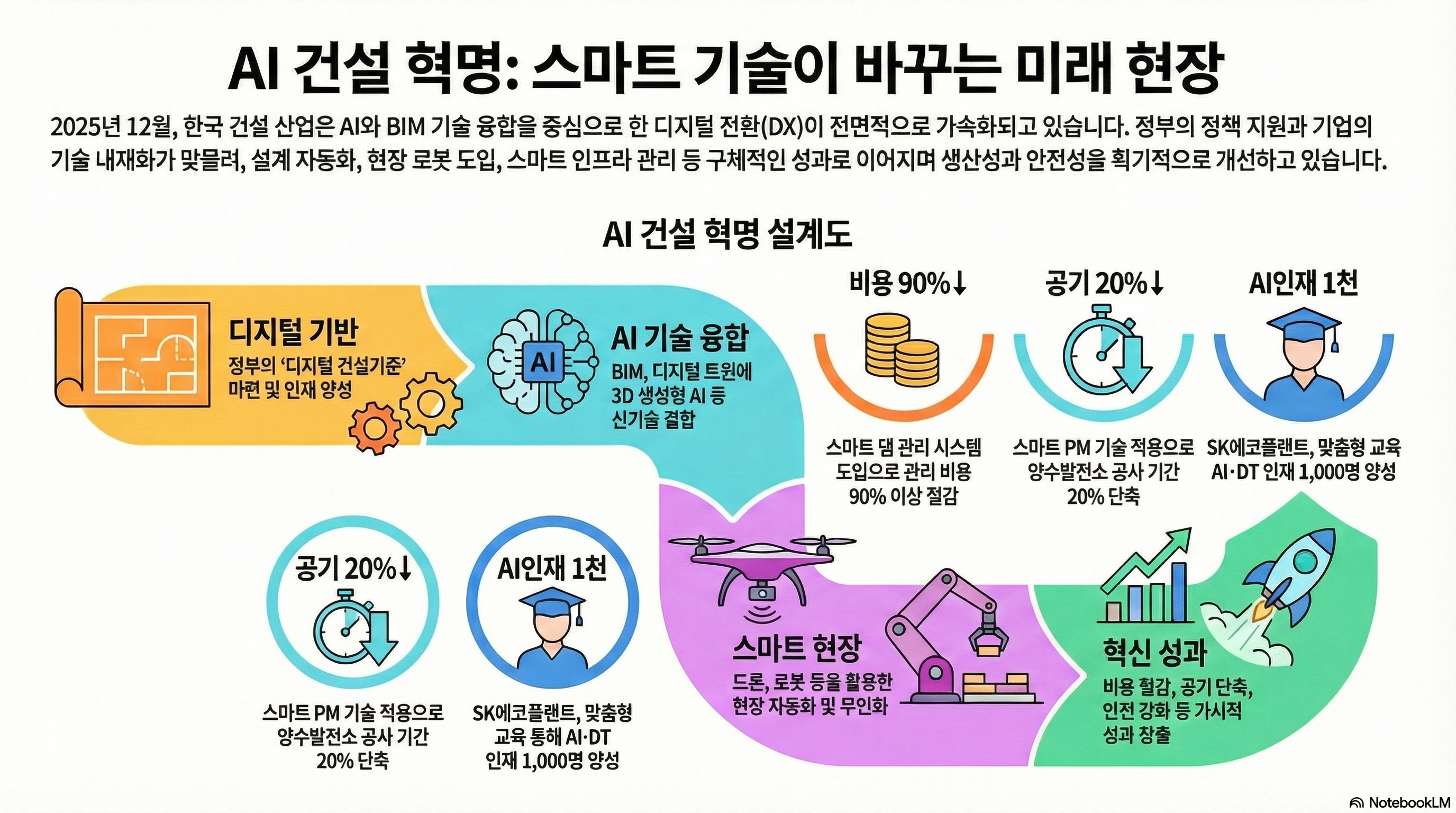 - 미래 인재 양성을 위한 교육계의 변화: 중앙대학교 등 다수 대학이 스마트건축 및 AI 관련 학과를 신설했으며, SK에코플랜트는 자체 AI·DT 교육 프로그램인 **'C.O.R.E'**를 통해 단기간에 1,000명의 이수자를 배출했다.