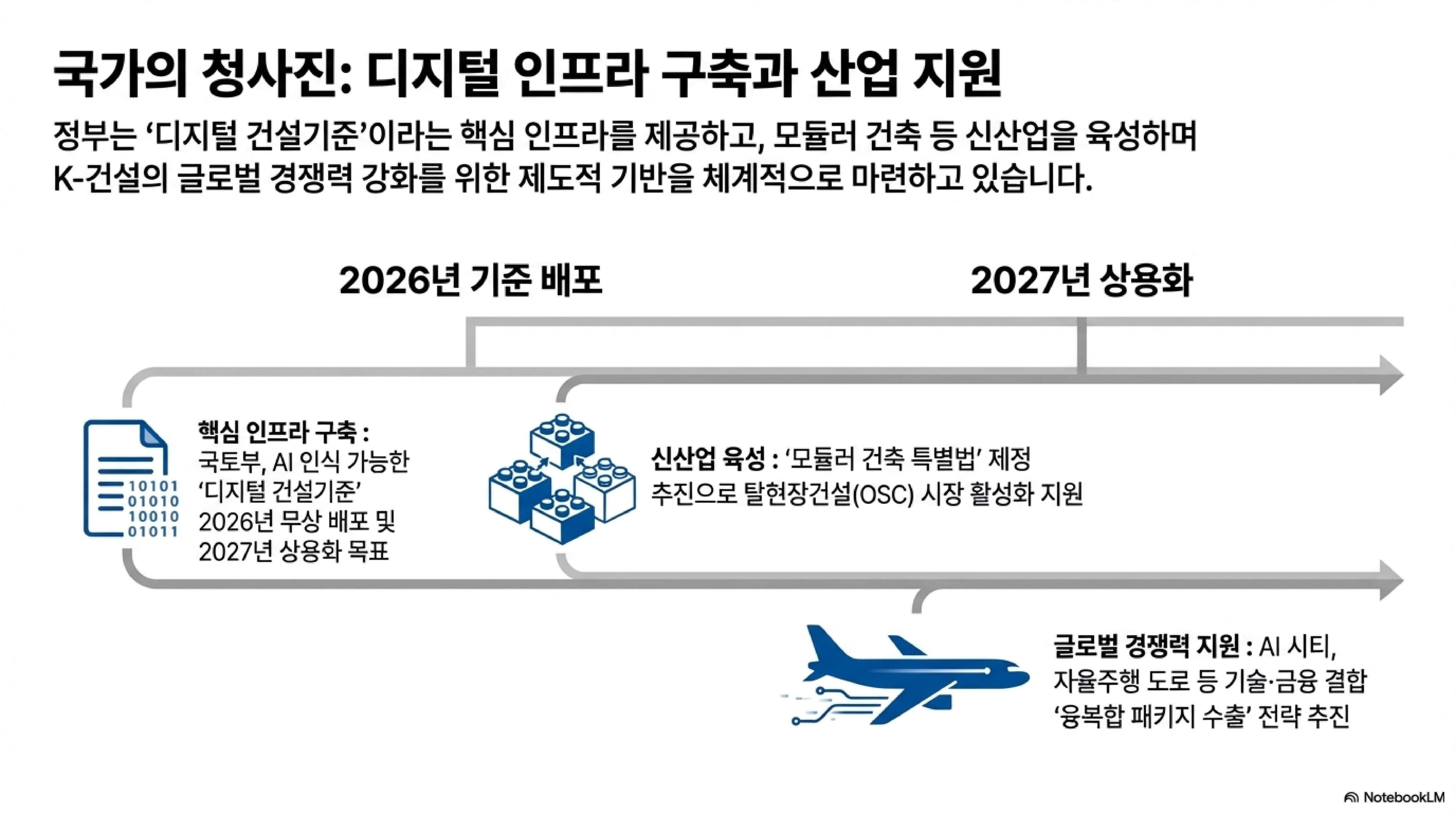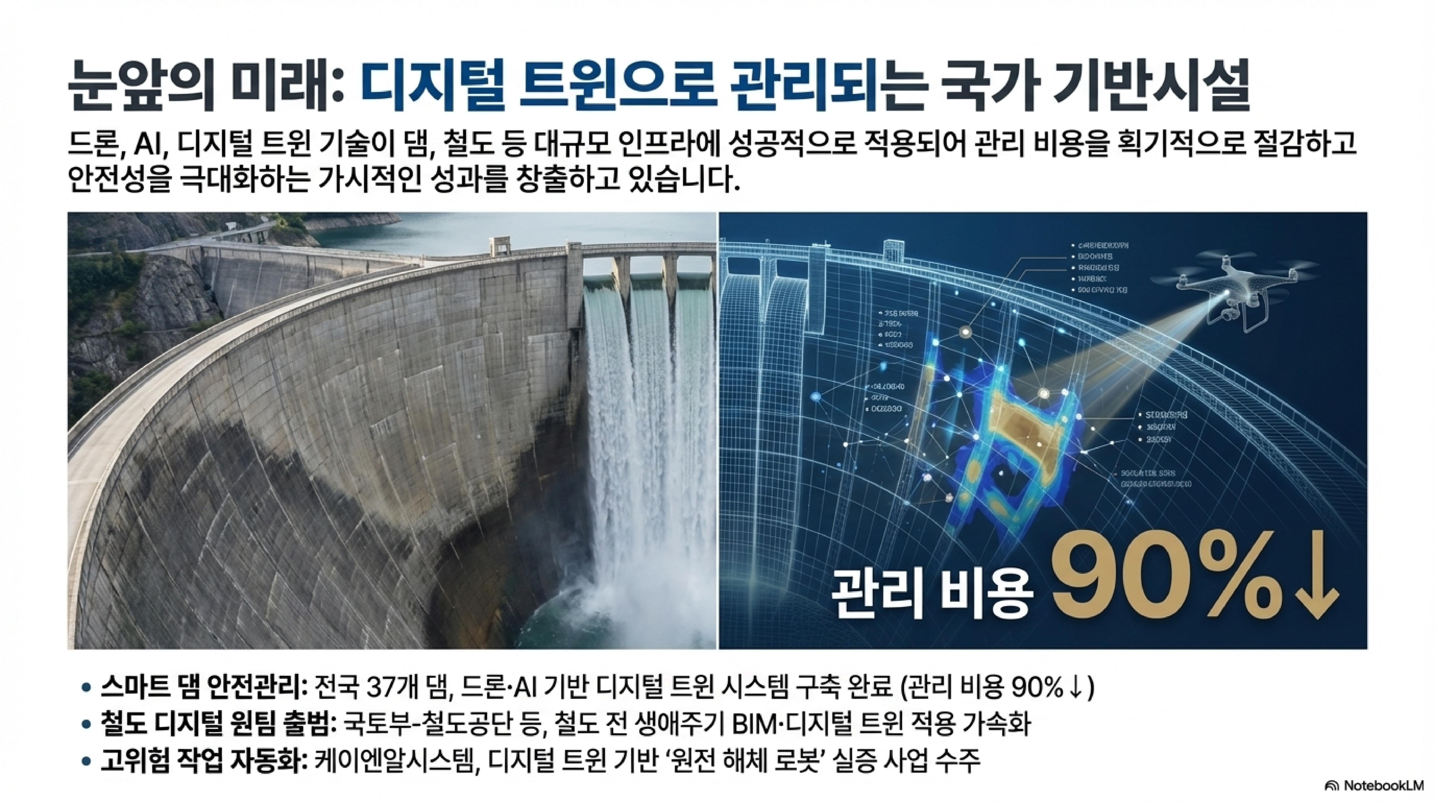 - 스마트 건설 기술의 고도화: 기후부와 한국수자원공사가 전국 37개 댐에 구축한 '스마트 댐 안전관리 시스템', 철도 역사에 디지털 트윈을 적용한 '스마트 스테이션' 구상, 그리고 BIM 통합형 DfMA(탈현장공법) 등 첨단 기술이 복합적으로 적용되고 있다.