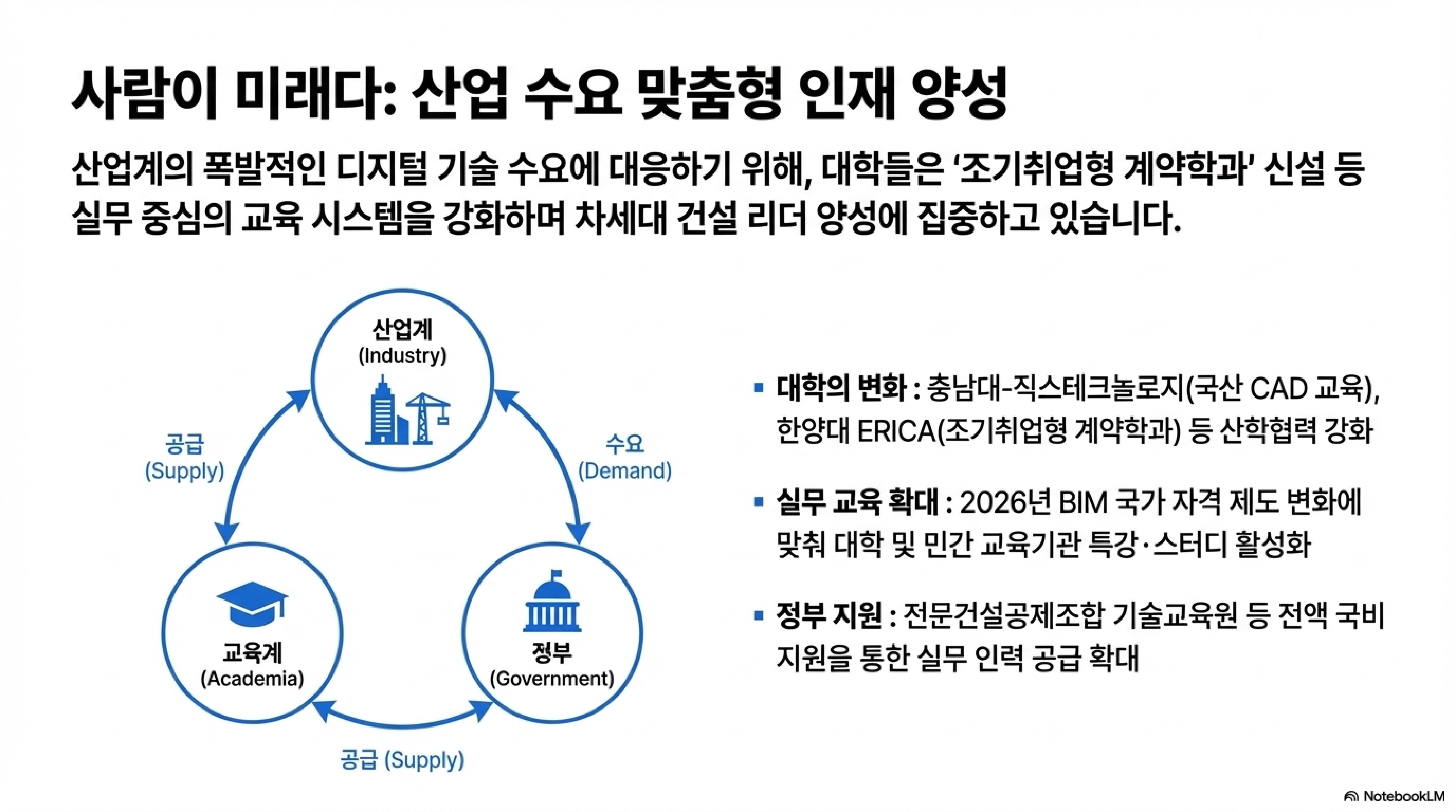 - 미래 인재: 대학 내 스마트건축 학과 신설 및 기업 자체 AI 교육 확대
