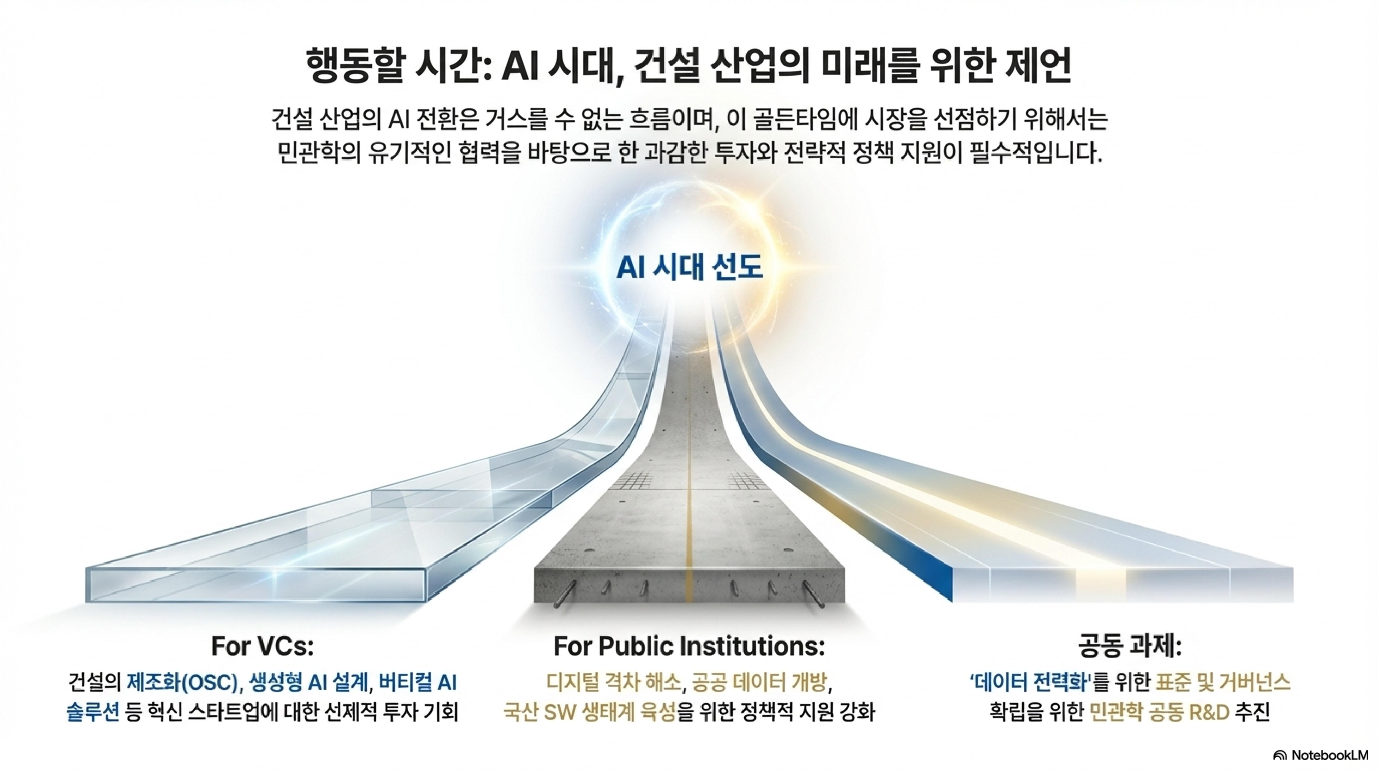 건설 산업의 성공적인 미래는 어느 한 주체의 노력만으로는 이룰 수 없다. 정부의 선도적인 정책, 산업계의 과감한 투자와 혁신, 그리고 학계의 유기적인 인재 양성 노력이 시너지를 이룰 때, 대한민국 건설 산업은 진정한 인공지능 전환(AX) 시대를 선도하게 될 것이다. 끊임없는 협력과 혁신 의지가 그 성공의 열쇠이다.