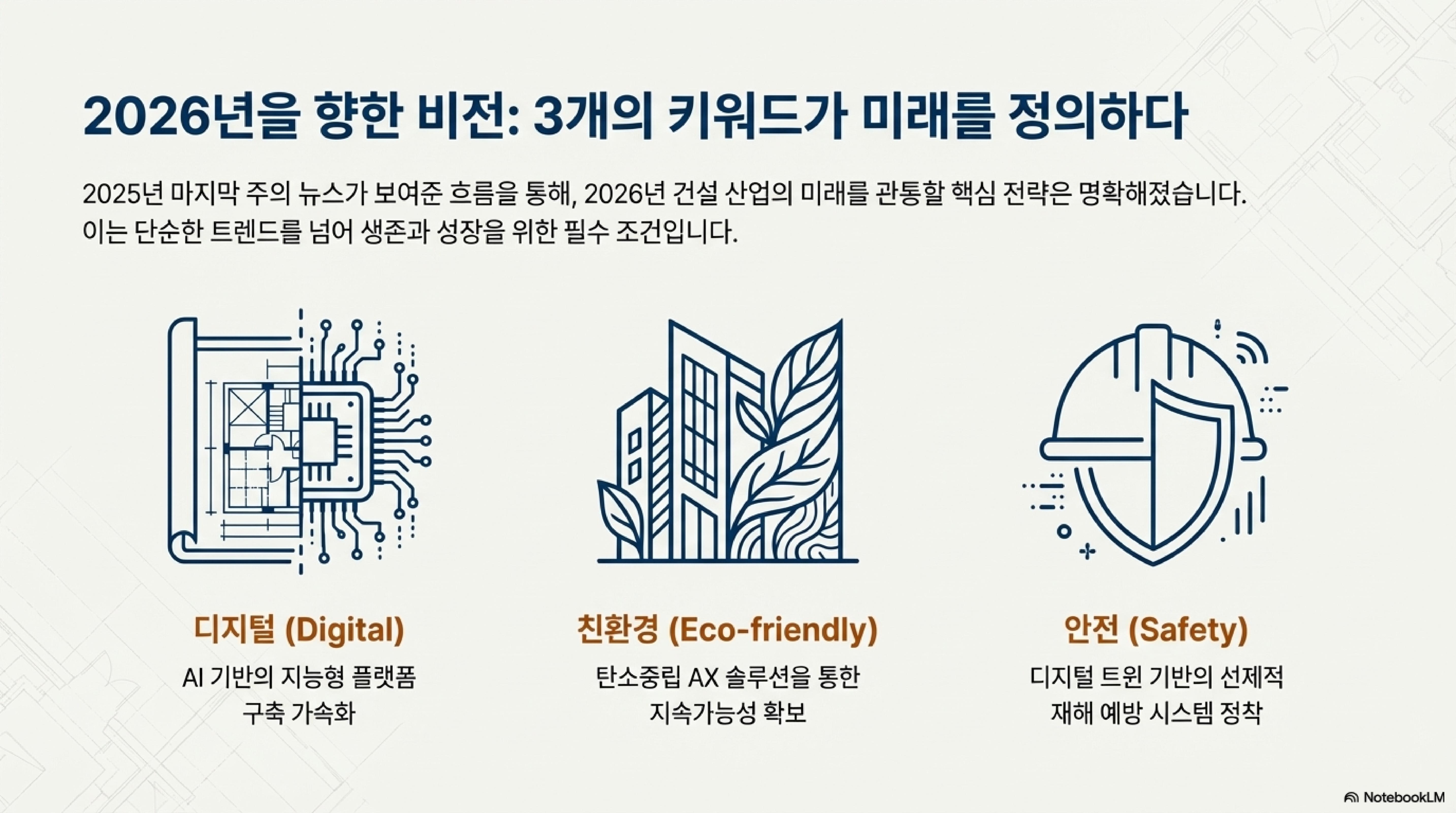 2026년 건설업계를 관통할 핵심 전략은 무엇일까요? AI가 분석한 결과, 우리는 다음 세 단어에 집중해야 합니다.