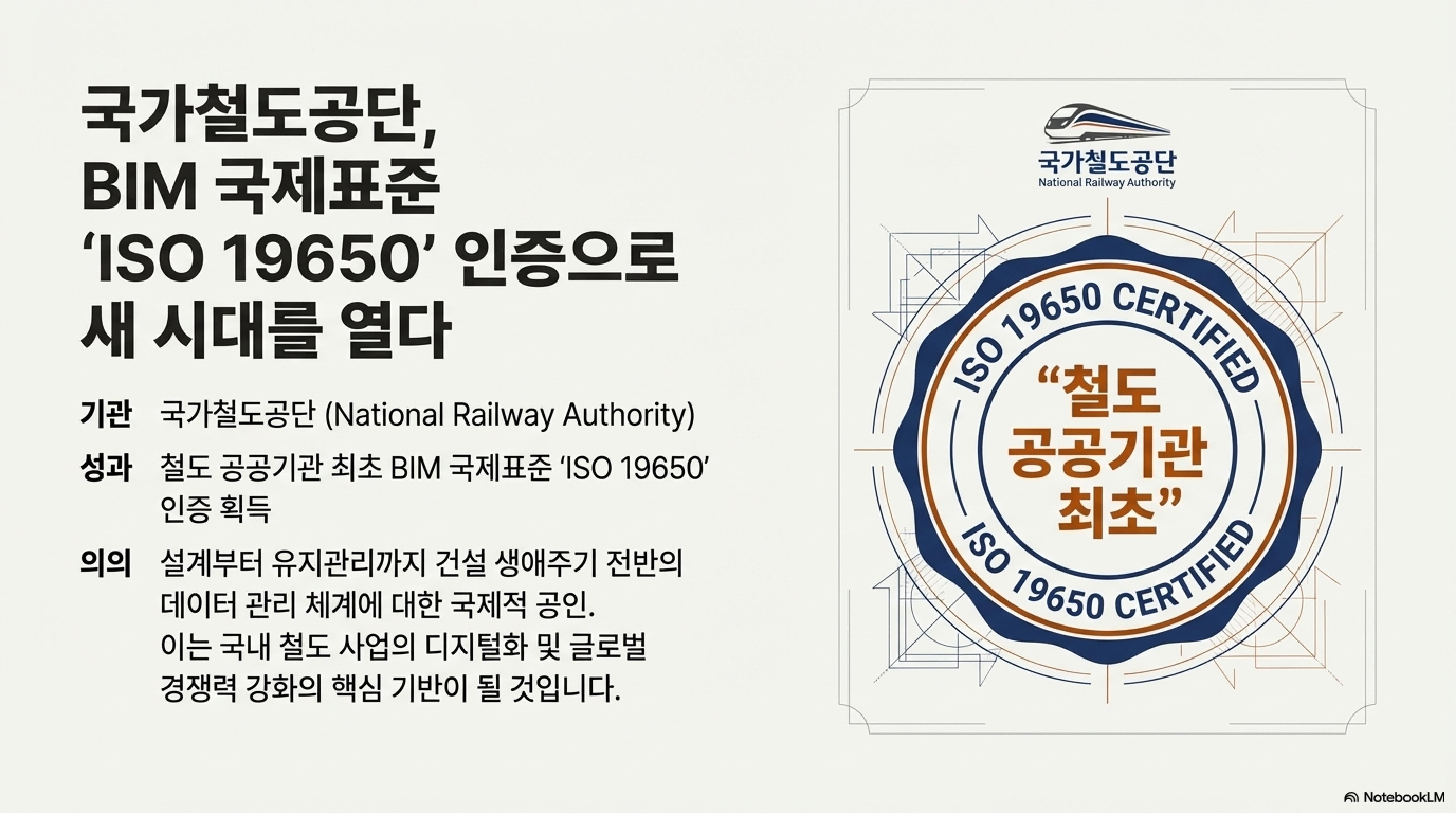 국내 사회기반시설(SOC) 분야에서 아주 반가운 소식이 들려왔습니다. 바로 국가철도공단이 철도 공공기관 최초로 BIM 국제표준인 'ISO 19650' 인증을 획득했다는 점인데요. 이는 단순히 기술을 도입한 수준을 넘어, 설계부터 유지관리까지 전 생애주기 데이터를 관리하는 체계가 세계적 수준임을 입증한 것입니다.