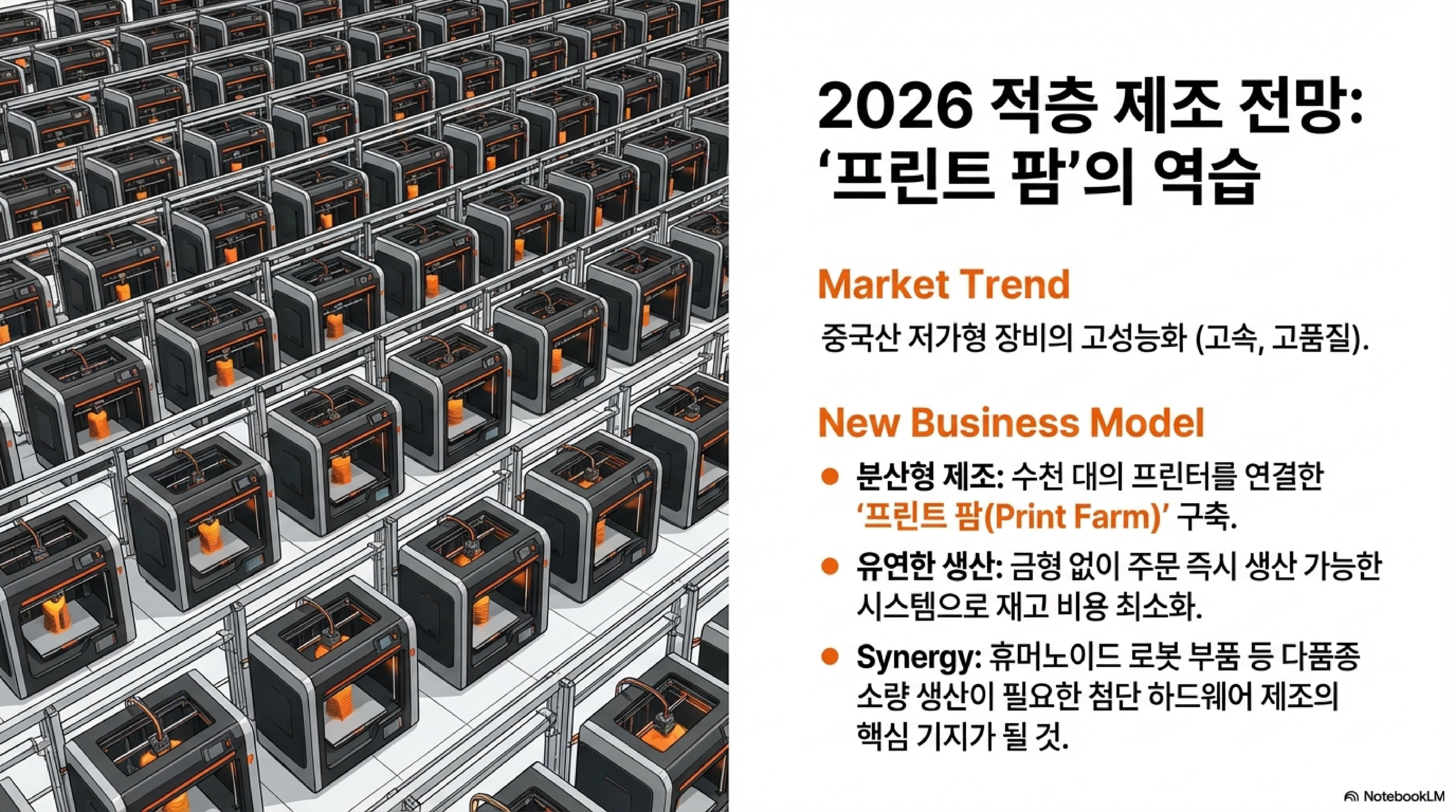 - 프린트 팜(Print Farm)과 분산 제조: 수백~수천 대의 저가형 고성능 프린터를 연결한 '프린트 팜'이 등장하여 대량 생산과 즉시 대응이 가능한 '온디맨드 제조'를 실현하고 있습니다.