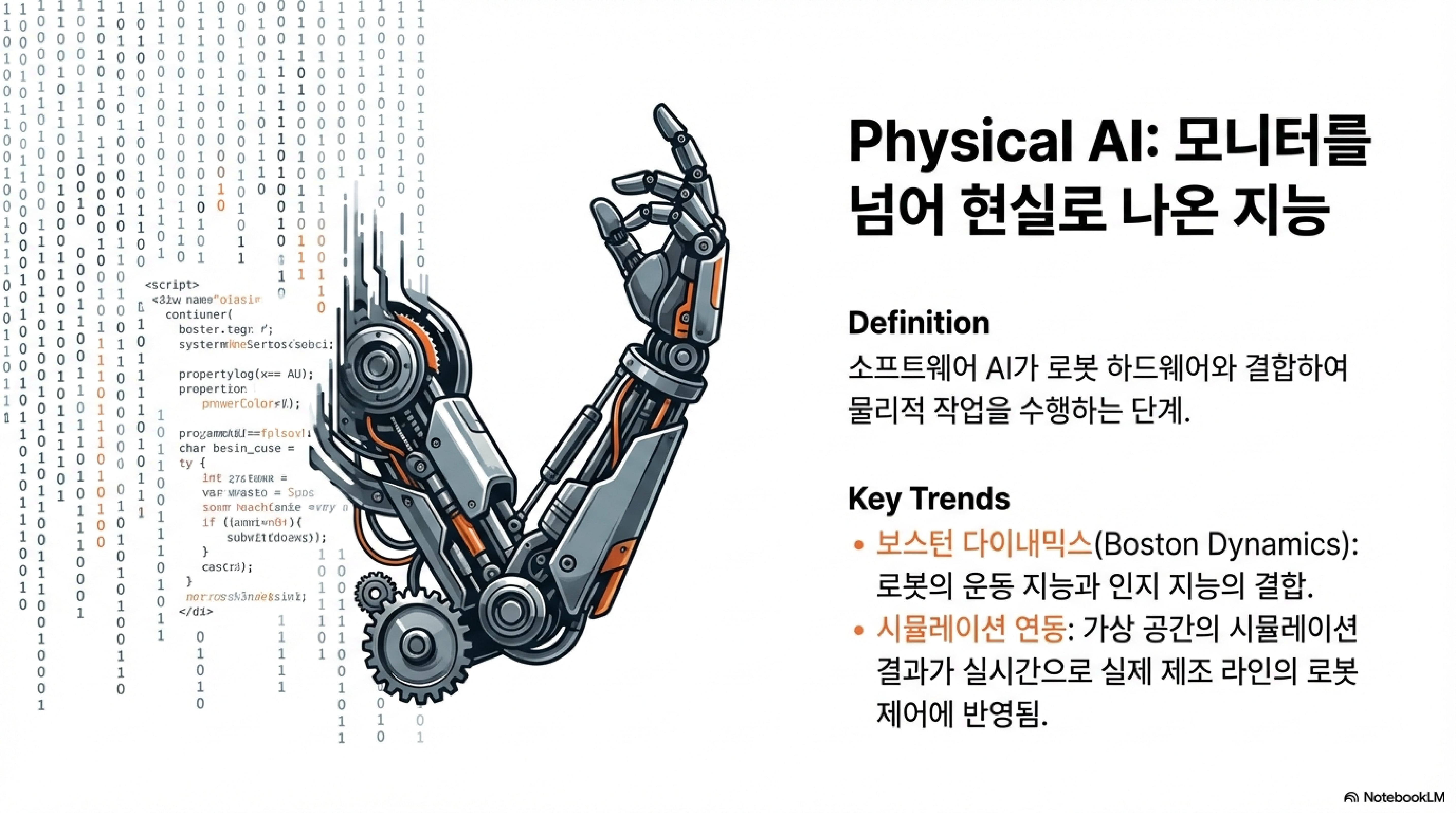 - 피지컬 AI(Physical AI)의 부상: AI가 모니터 밖 실물 세계에서 로봇의 움직임을 제어하는 단계로 진화합니다. 2026년 CES의 핵심 키워드이기도 하며, '불 꺼진 공장(Dark Factory)' 구현의 핵심입니다.