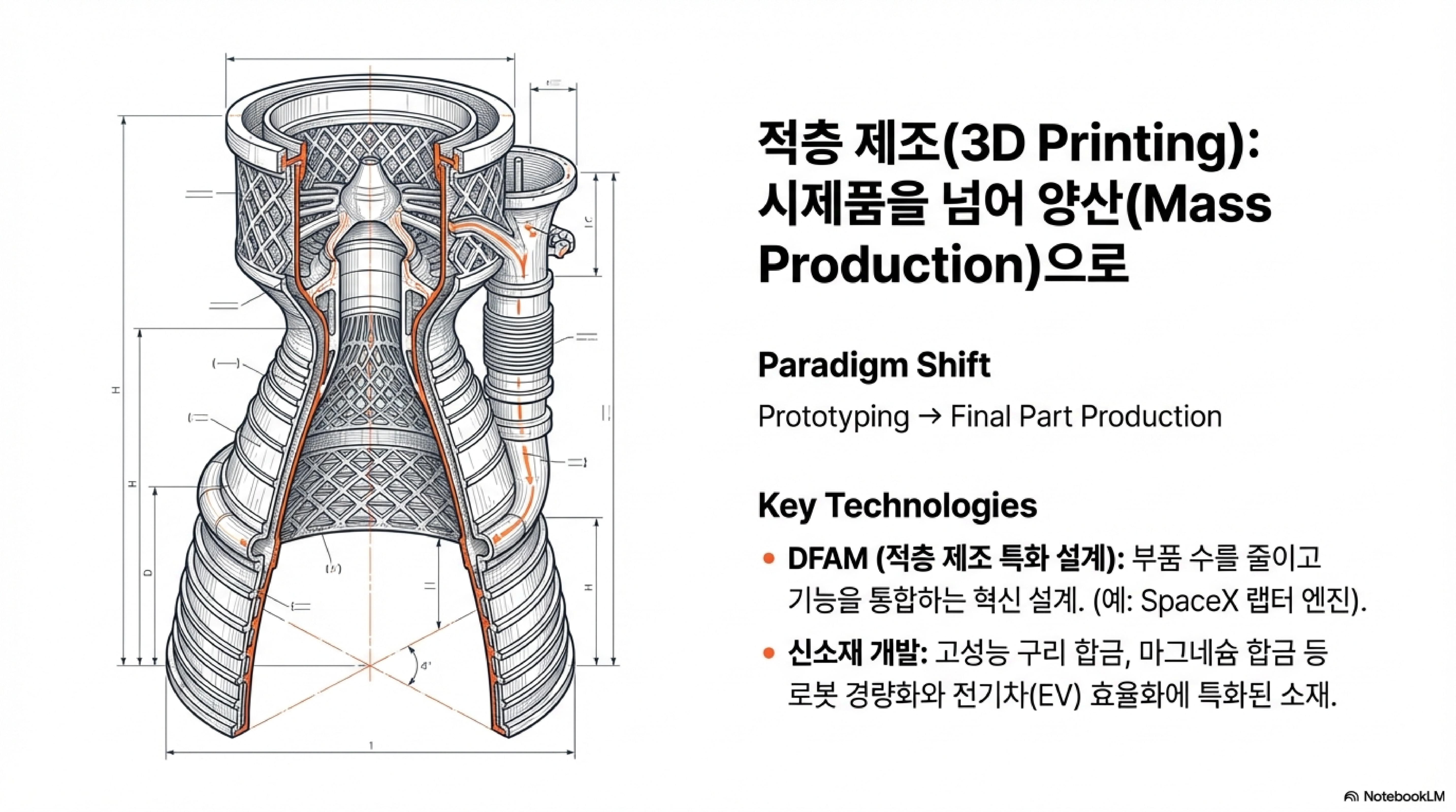 - 적층 제조: 시제품 제작 단계에서 최종 부품 양산 체제로 완전히 전환되었으며, DFAM(적층 제조를 위한 설계) 기술을 통한 부품 통합과 경량화가 핵심입니다.
