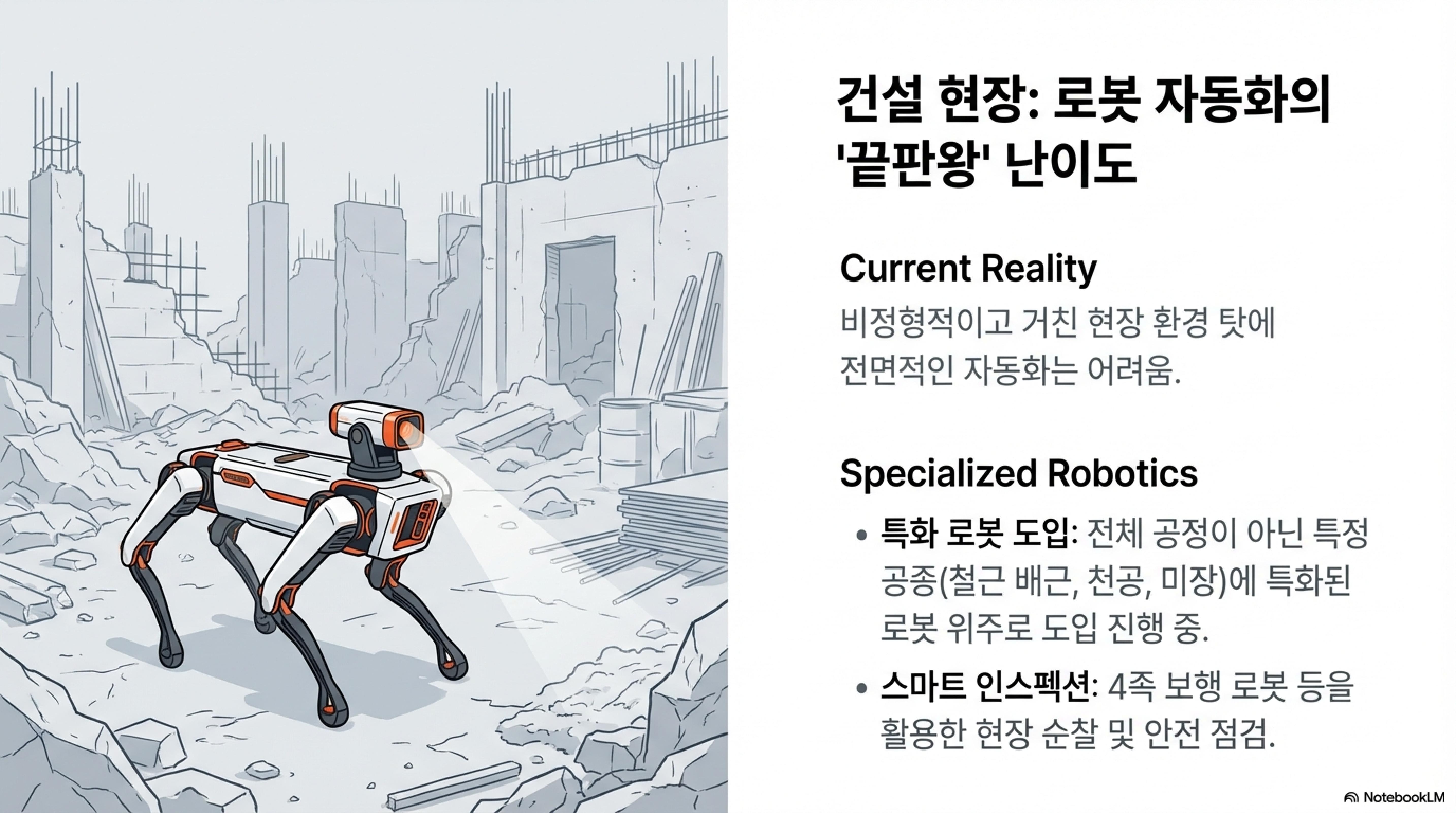- 특화 로봇의 확산: 안드로이드 형태보다는 천공, 미장, 철근 매달기 등 특정 공정에 특화된 로봇이나 현장을 순찰하며 상태를 스캔하는 '스마트 인스펙션' 로봇이 주류를 이룰 전망입니다.