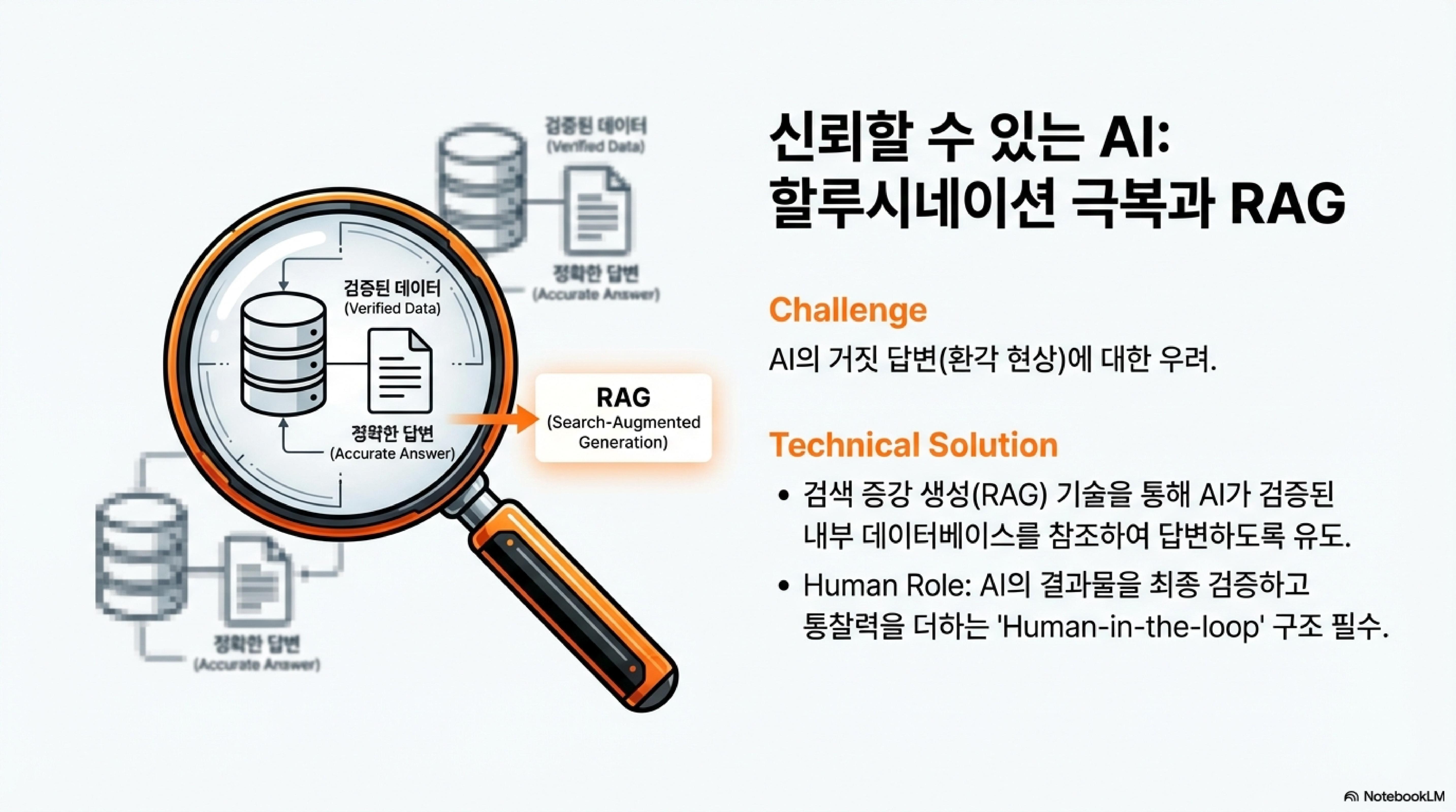 AI가 그럴싸하지만 틀린 답변을 내놓는 환각 현상은 산업 현장에서 치명적일 수 있습니다. 이를 막기 위해 도메인 특화 데이터와 RAG(검색 증강 기법)를 도입하는 것이 무엇보다 중요합니다.