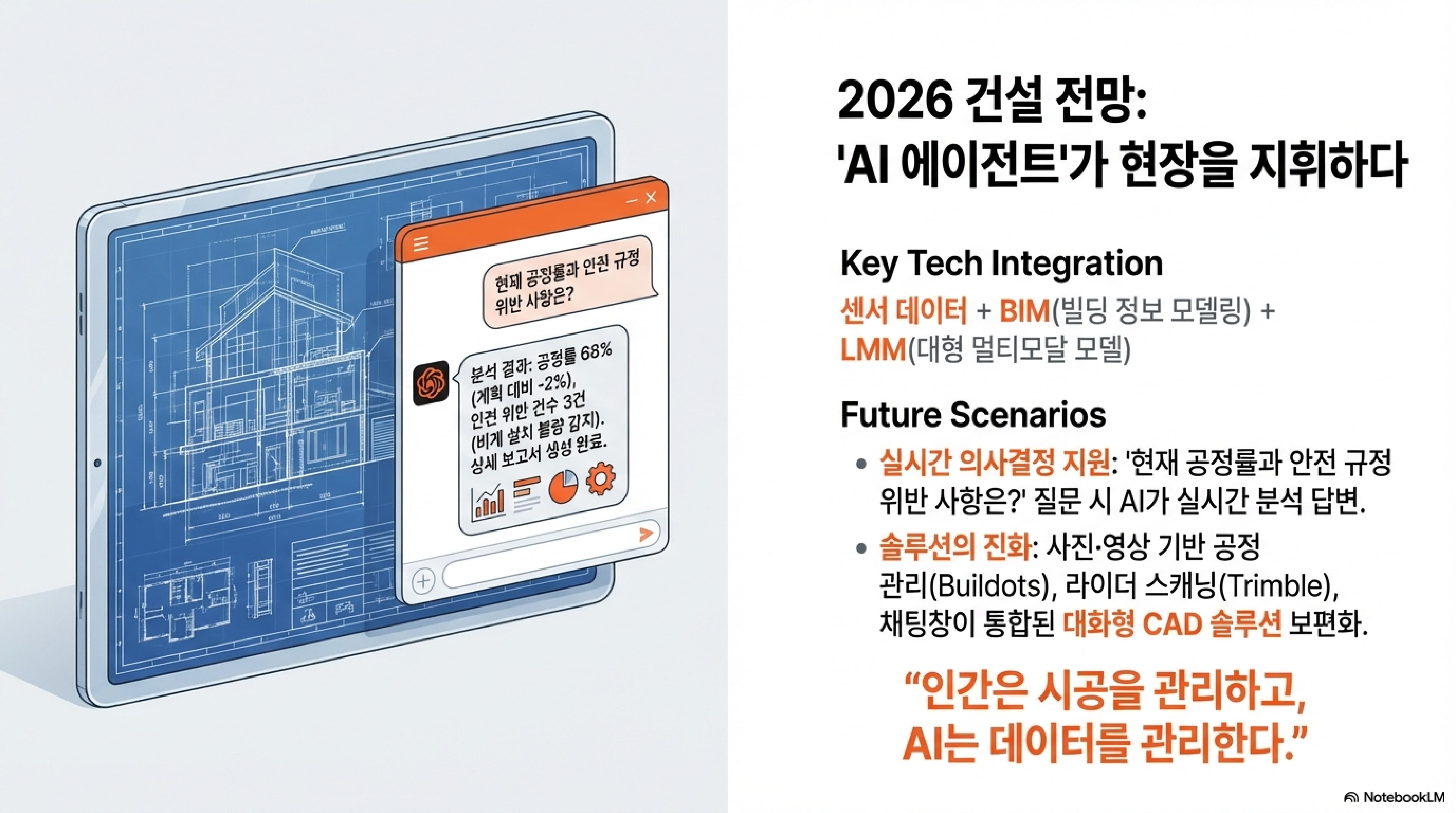 - AI 에이전트의 역할: 사용자가 질문하면 BIM 데이터와 센서 정보를 결합해 시공 단계의 이상 패턴이나 안전 문제를 실시간으로 답변해 주는 의사결정 지원 시스템이 도입됩니다.