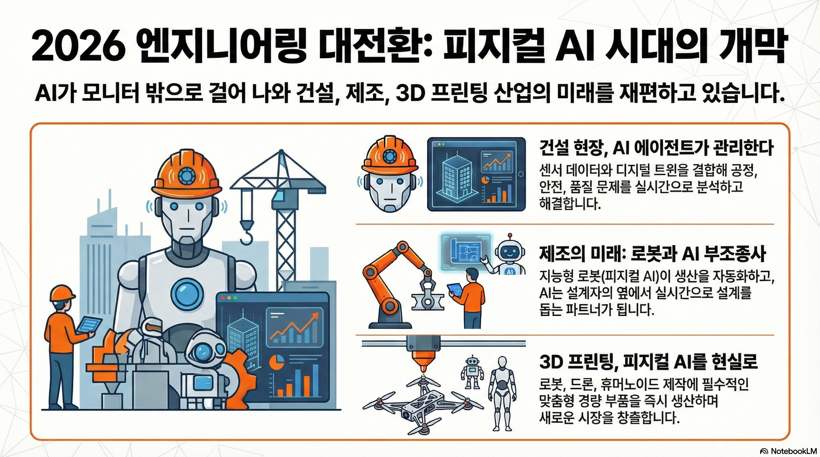 2026년 엔지니어링 업계는 **"모든 기술의 실체화"**를 향해 나아가고 있습니다. 건설 현장의 자동화 로봇, 제조 공장의 피지컬 AI, 적층 제조를 통한 분산형 생산 시스템은 더 이상 미래의 이야기가 아닙니다. 기업은 클라우드 기반의 데이터 거버넌스를 확립하고, 인간의 통찰력과 AI의 속도를 결합한 '디지털 스레드'를 구축함으로써 AX 시대의 경쟁 우위를 확보해야 합니다.