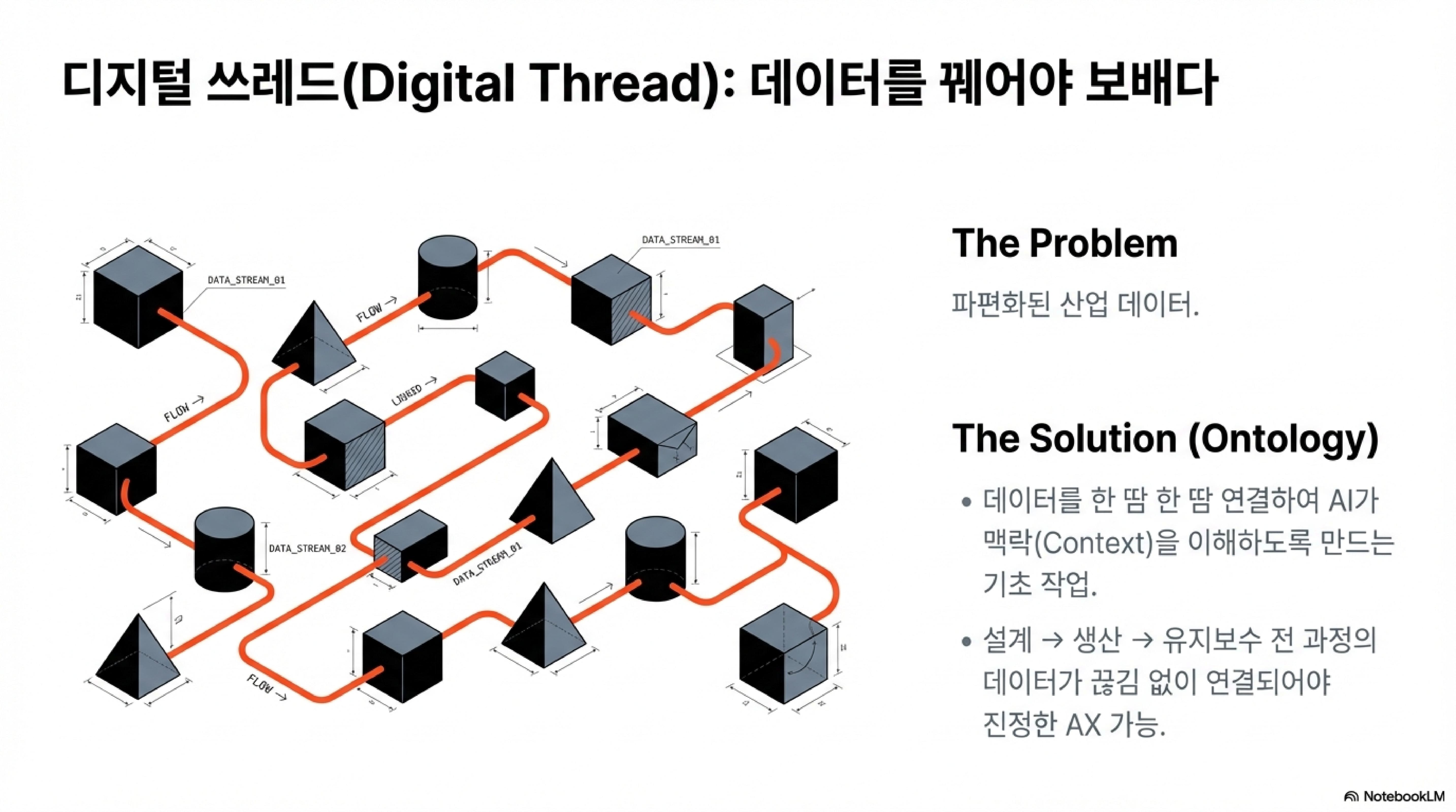 - 디지털 스레드(Digital Thread): 단순한 데이터 나열이 아닌, 지식의 흐름을 한 땀 한 땀 연결하는 온톨로지 구축이 필요합니다. 이는 AI가 단순 확률적 답변을 넘어 진정한 산업적 통찰을 제공하게 만드는 토대가 됩니다.