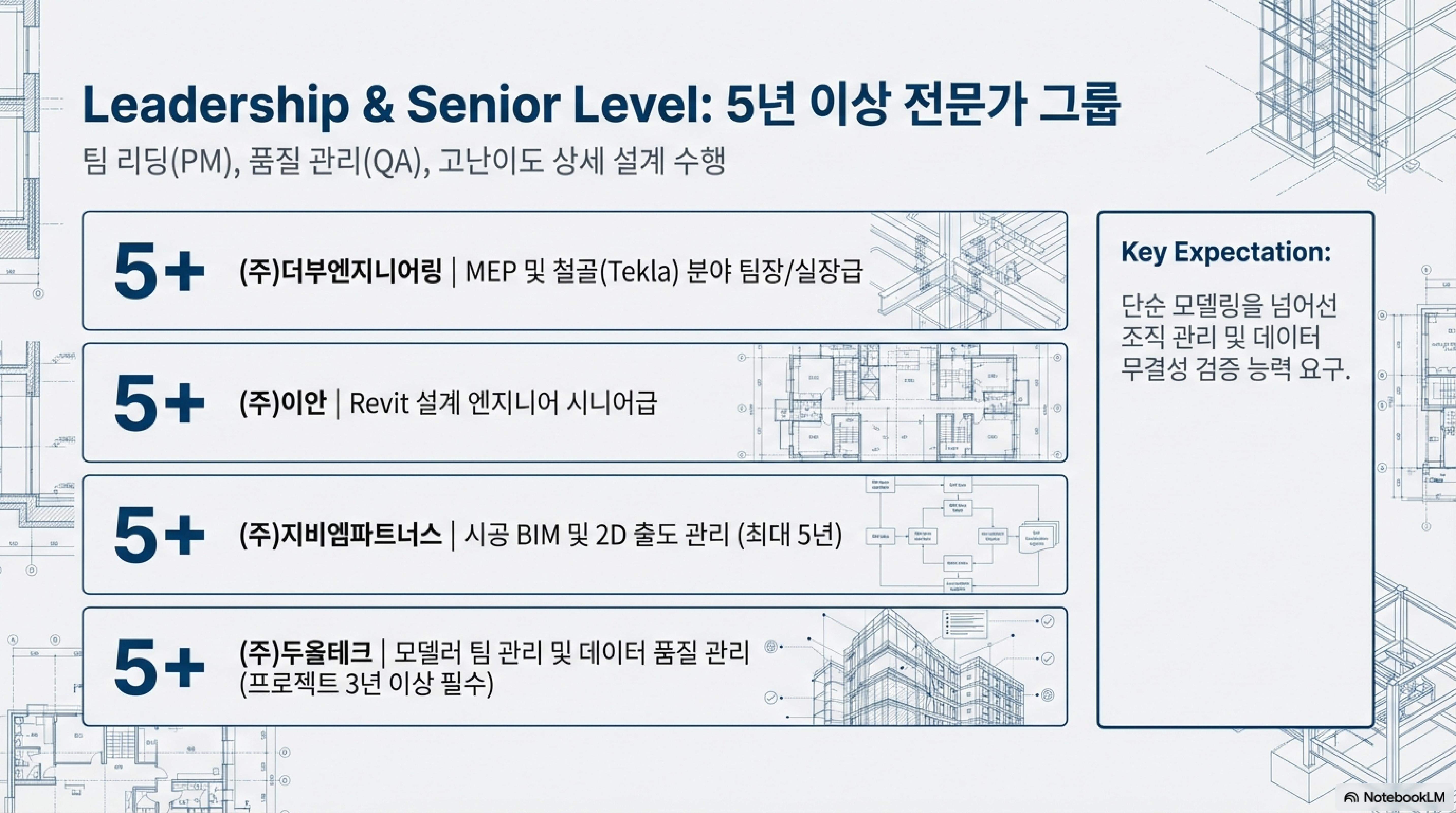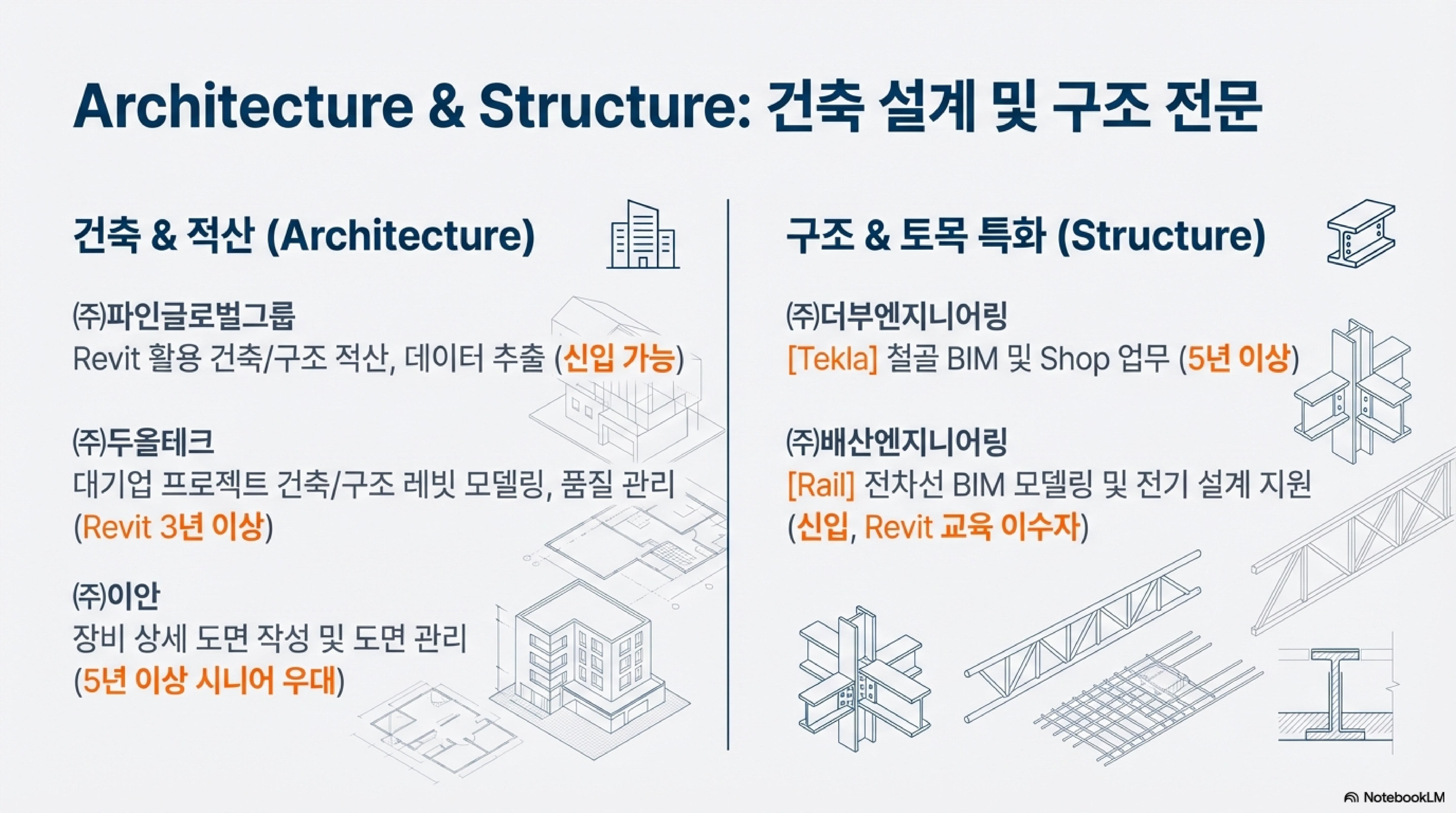 올해 초 구인 시장의 가장 큰 특징은 **'직무의 전문화'**입니다. 예전에는 'BIM 모델러'라는 이름으로 뭉뚱그려 뽑았다면, 이제는 건축, MEP(설비), 철골, 그리고 기술 연구 분야까지 아주 세밀하게 나뉘어 인재를 찾고 있어요.
