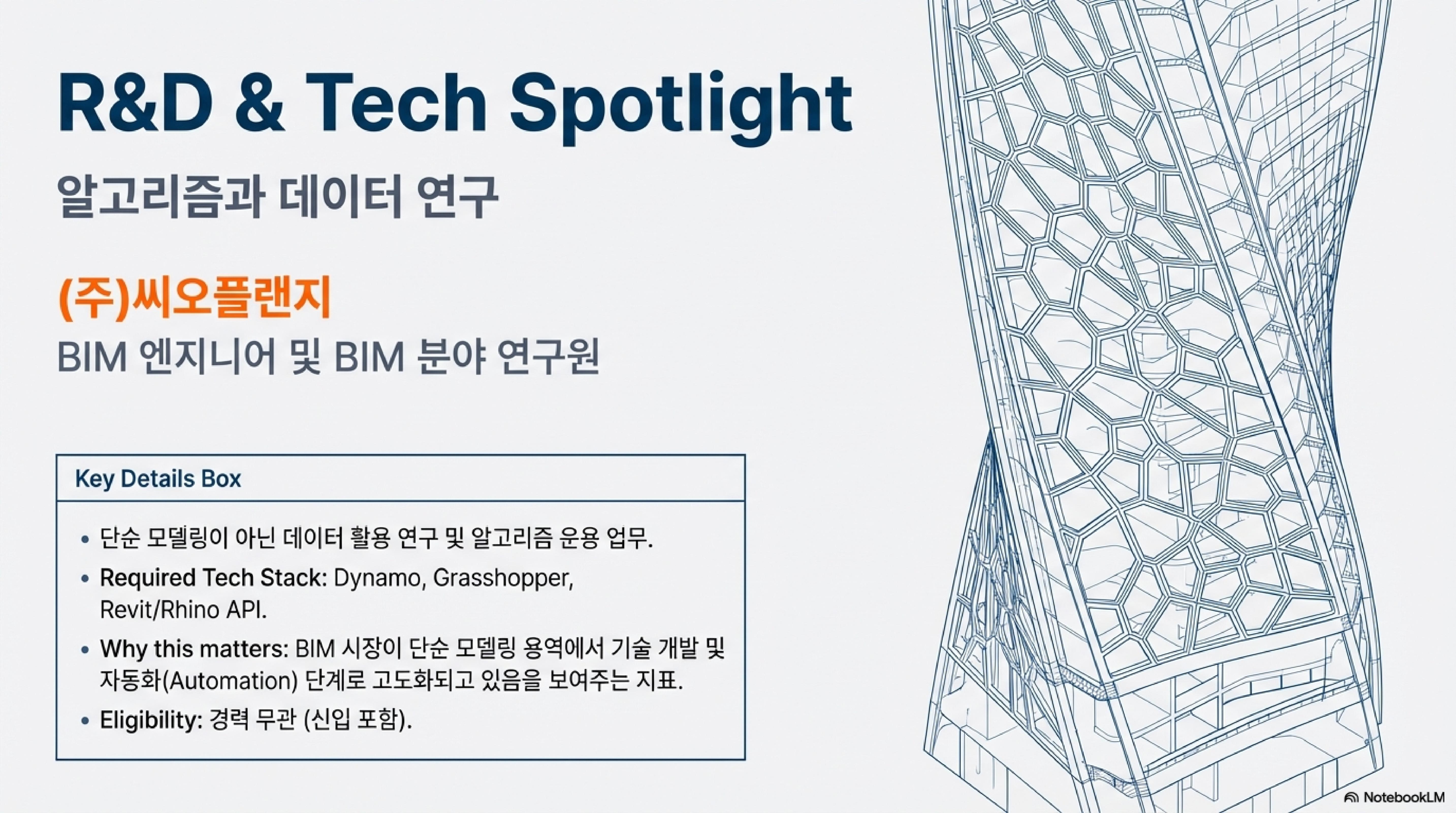 | 기술연구 | BIM 데이터 활용 알고리즘 개발 | Dynamo, Grasshopper |