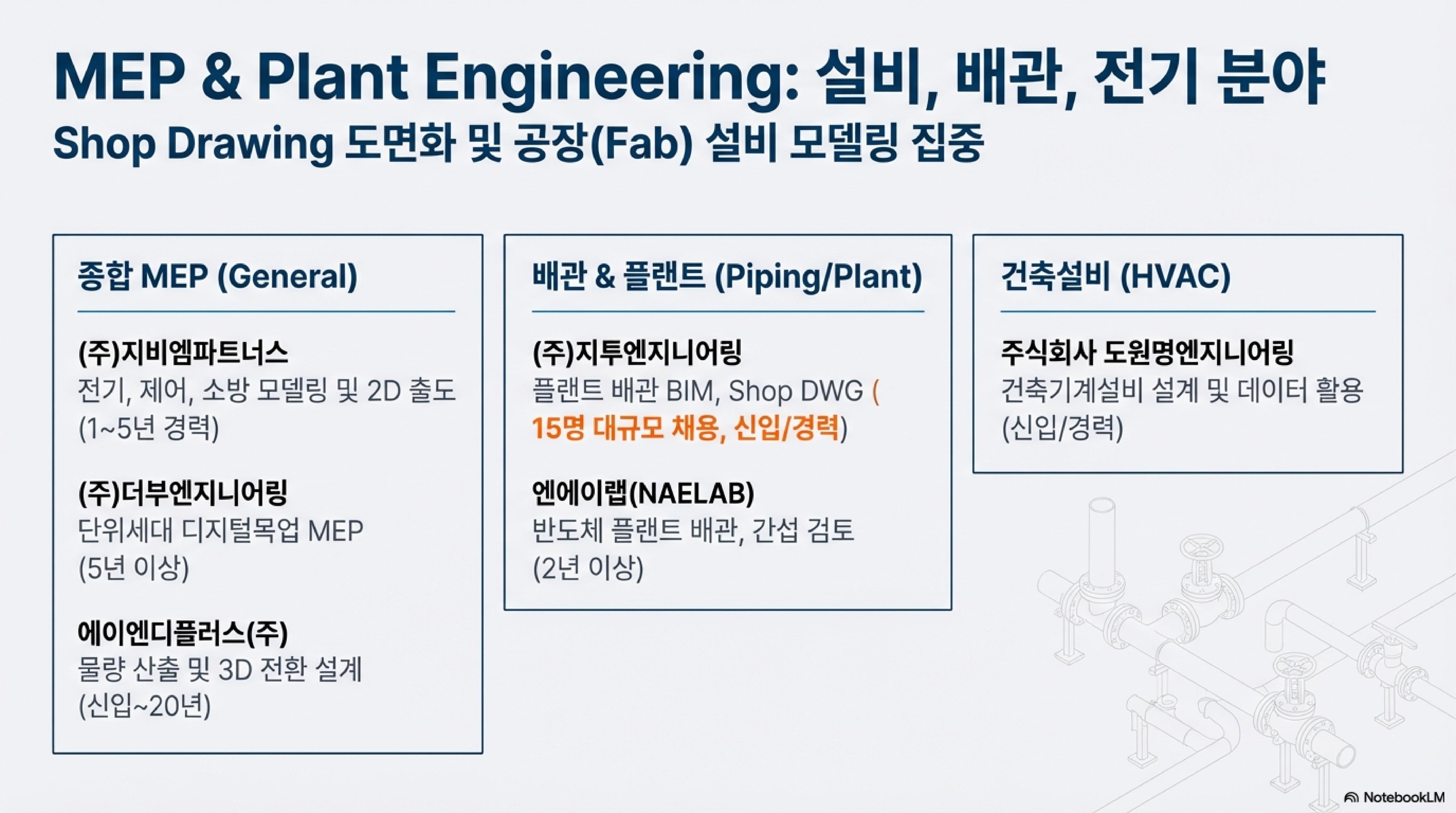 | MEP/플랜트 | 배관·전기 간섭 체크 및 Shop 도면 | Revit, 지투엔지니어링 등 활용 |