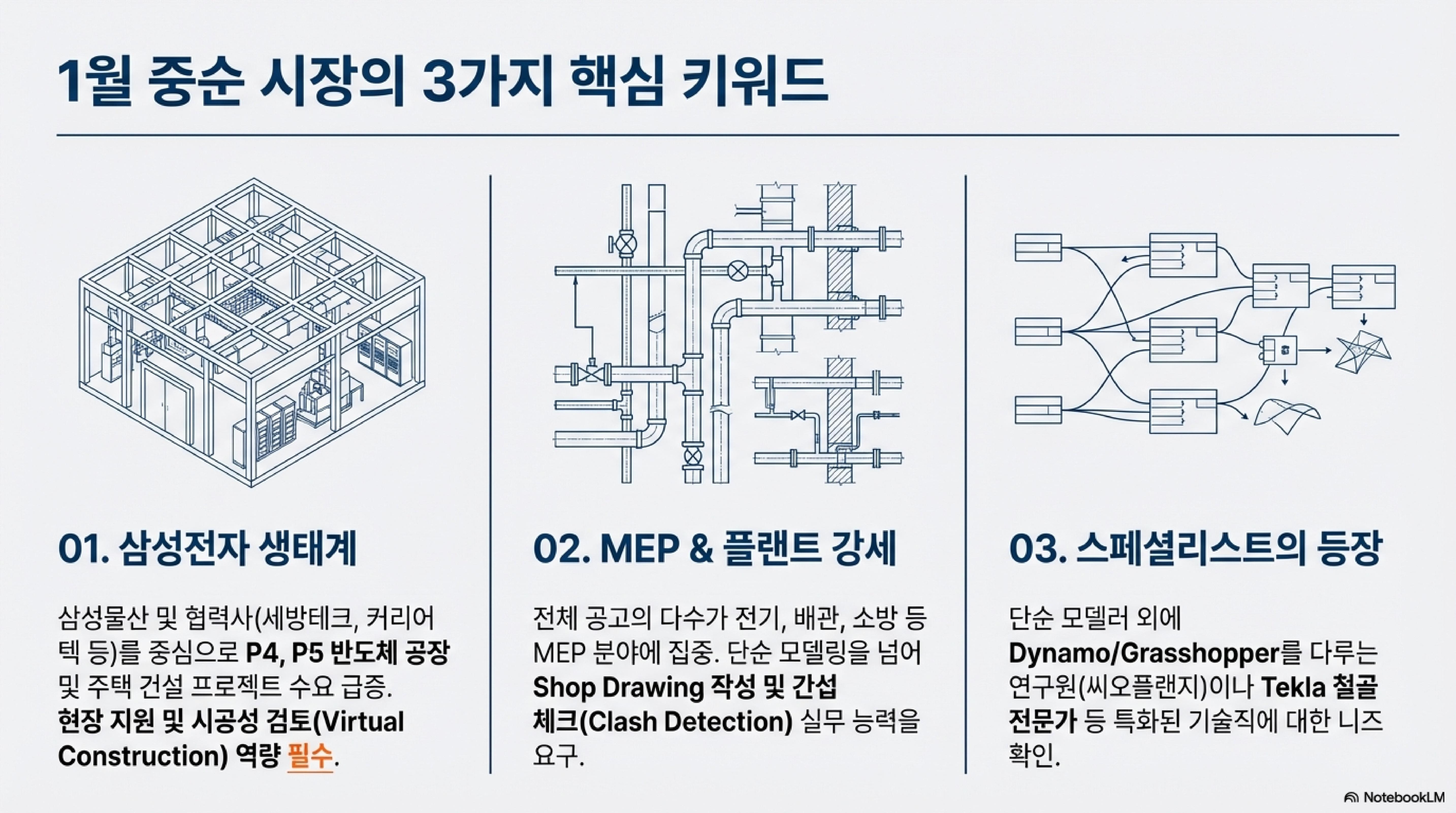 특히 삼성전자 P4, P5 현장 같은 거대 플랜트 프로젝트가 활발해지면서 실무 능력의 기준이 한층 높아진 것을 느낄 수 있었습니다. 오늘 제가 정리해 드리는 브리핑을 통해 올해의 커리어 전략을 세워보시는 건 어떨까요? 자, 그럼 시작해 보겠습니다! 😊
