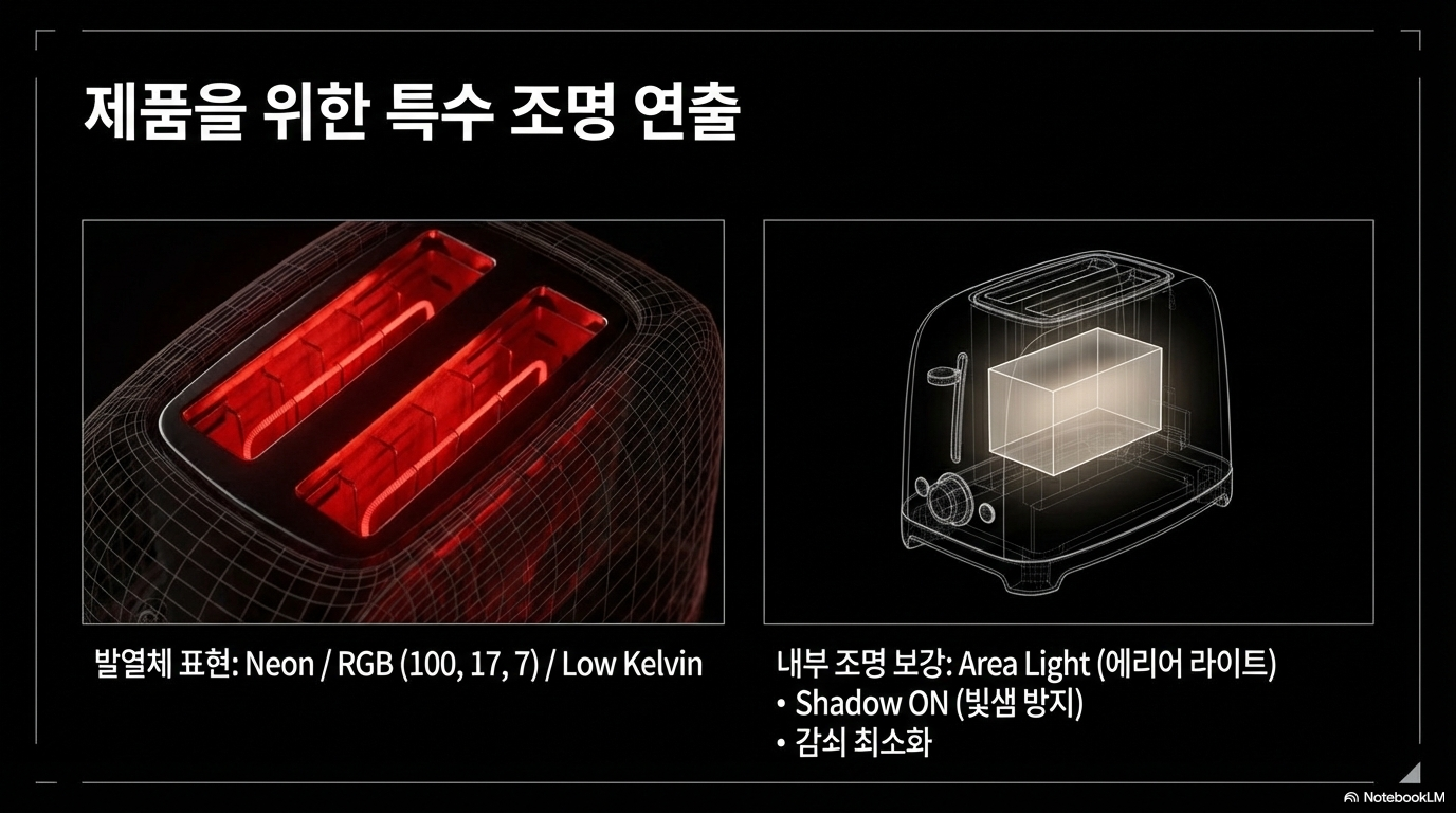 • 제품 시각화 디테일: 발열체 표현을 위한 이미시브 재질과 에리어 라이트의 조합, 환경 프리셋을 활용한 룩뎁(Look-dev) 과정이 포함됩니다.