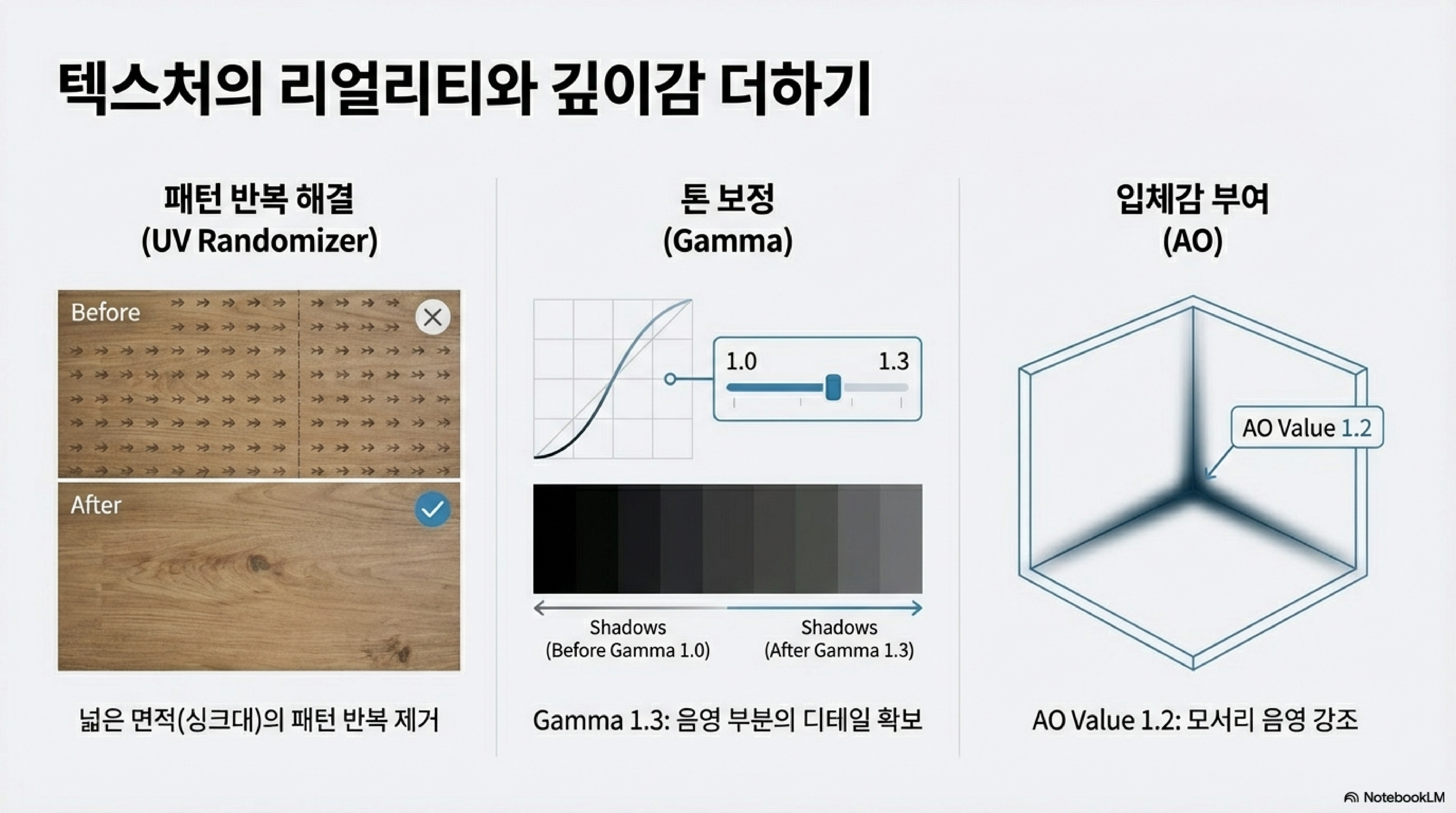 • 고도화된 재질 표현: UV 좌표계(월드/로컬 스페이스), 트라이플래너(Triplanar), 앰비언트 오클루전(AO) 등을 활용해 입체감과 자연스러운 질감을 구현합니다.