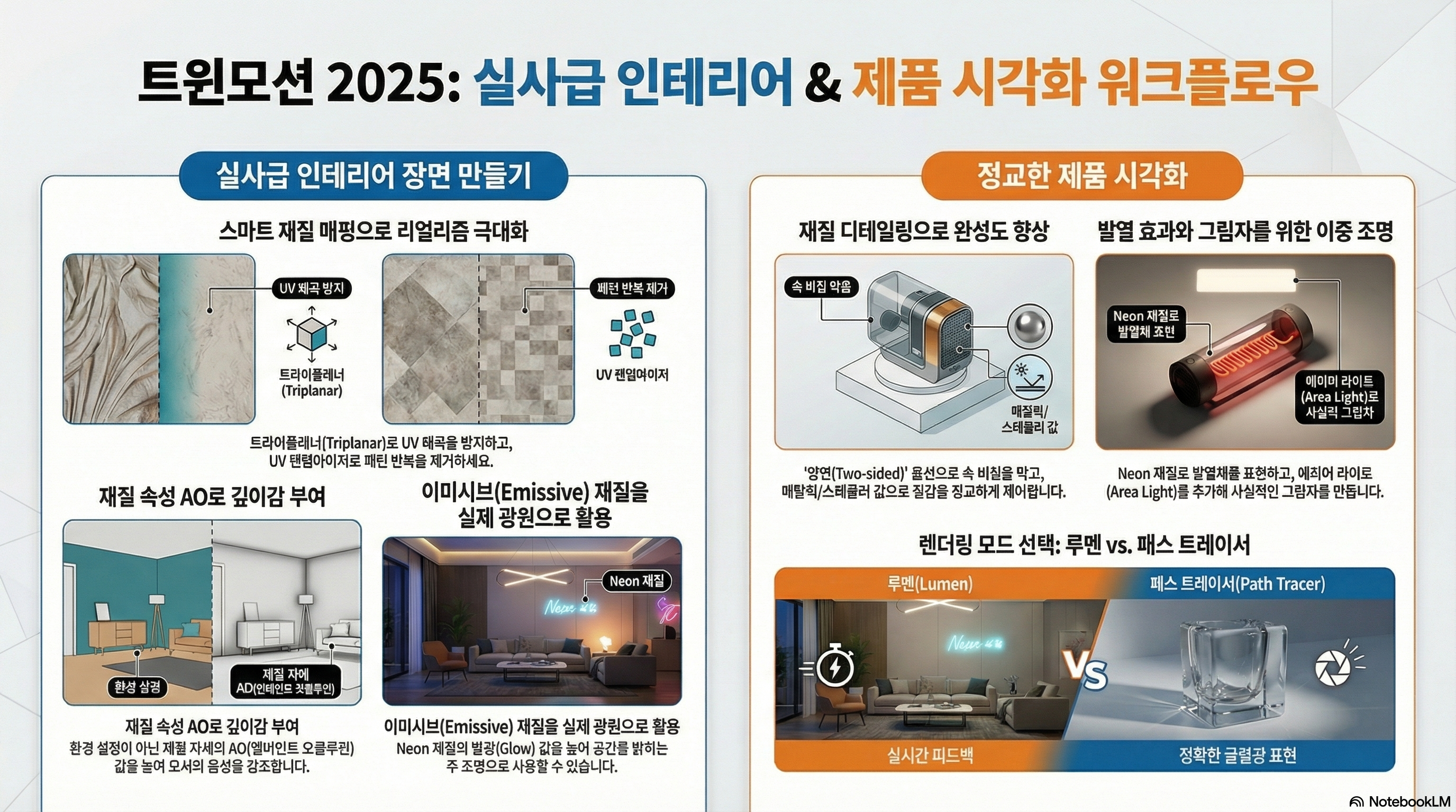 트윈모션 2025는 루멘 엔진의 강화로 인해 실시간 작업성과 고품질 결과물 사이의 균형을 성공적으로 구축했습니다. 특히 인테리어와 제품 시각화 과정에서 UV 좌표계의 올바른 이해, AO를 통한 깊이감 부여, 그리고 이미시브와 보조 광원의 조화가 결과물의 퀄리티를 결정짓는 핵심 요소입니다. 이를 통해 디자이너는 클라이언트에게 실시간으로 다양한 시안을 제안하는 동시에 최종 결과물급의 고해상도 이미지를 신속하게 확보할 수 있습니다.