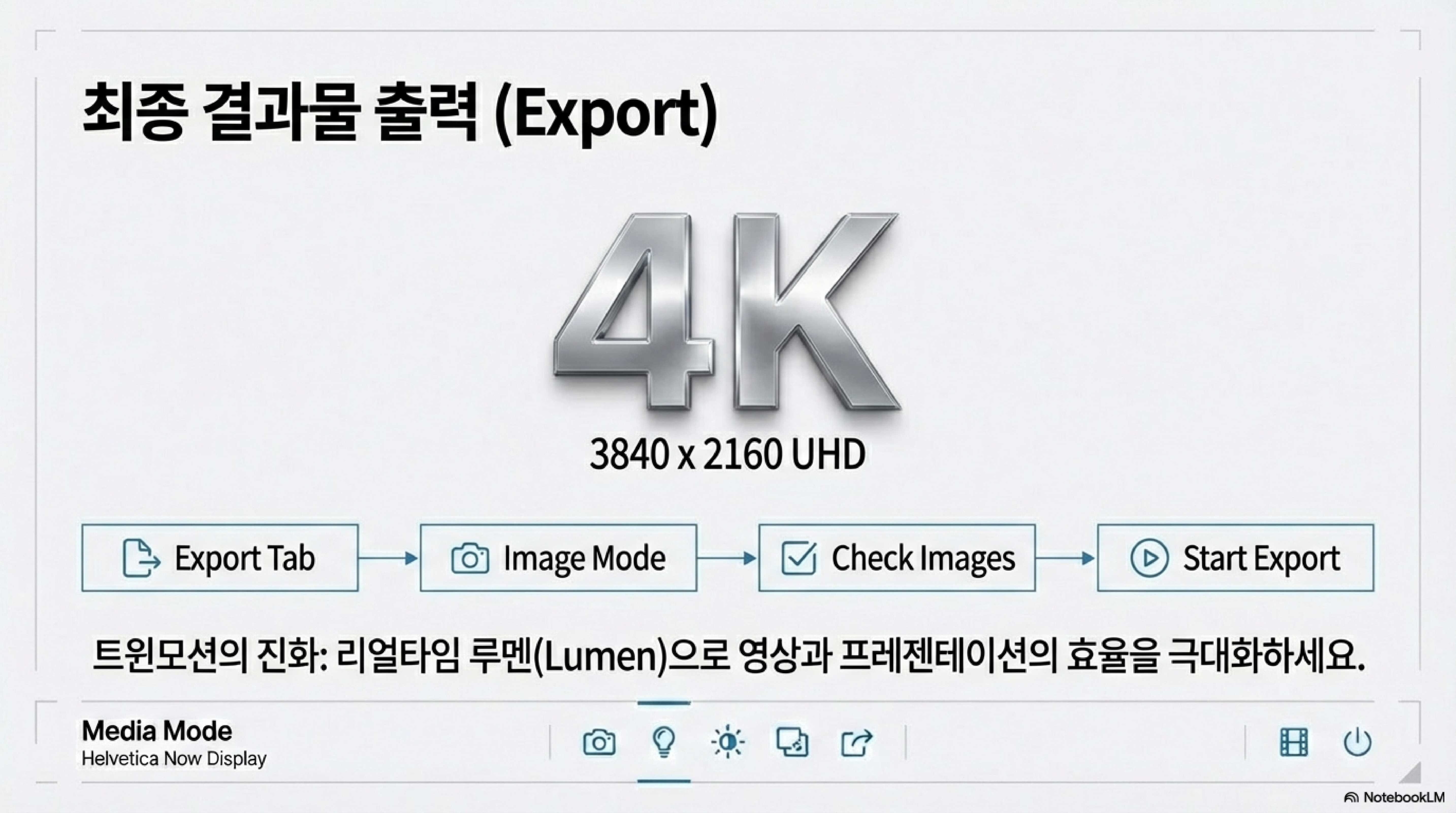 • 해상도: 리얼타임 렌더링의 강점을 활용하여 4K (3840 x 2160) UHD 해상도 출력을 권장합니다.