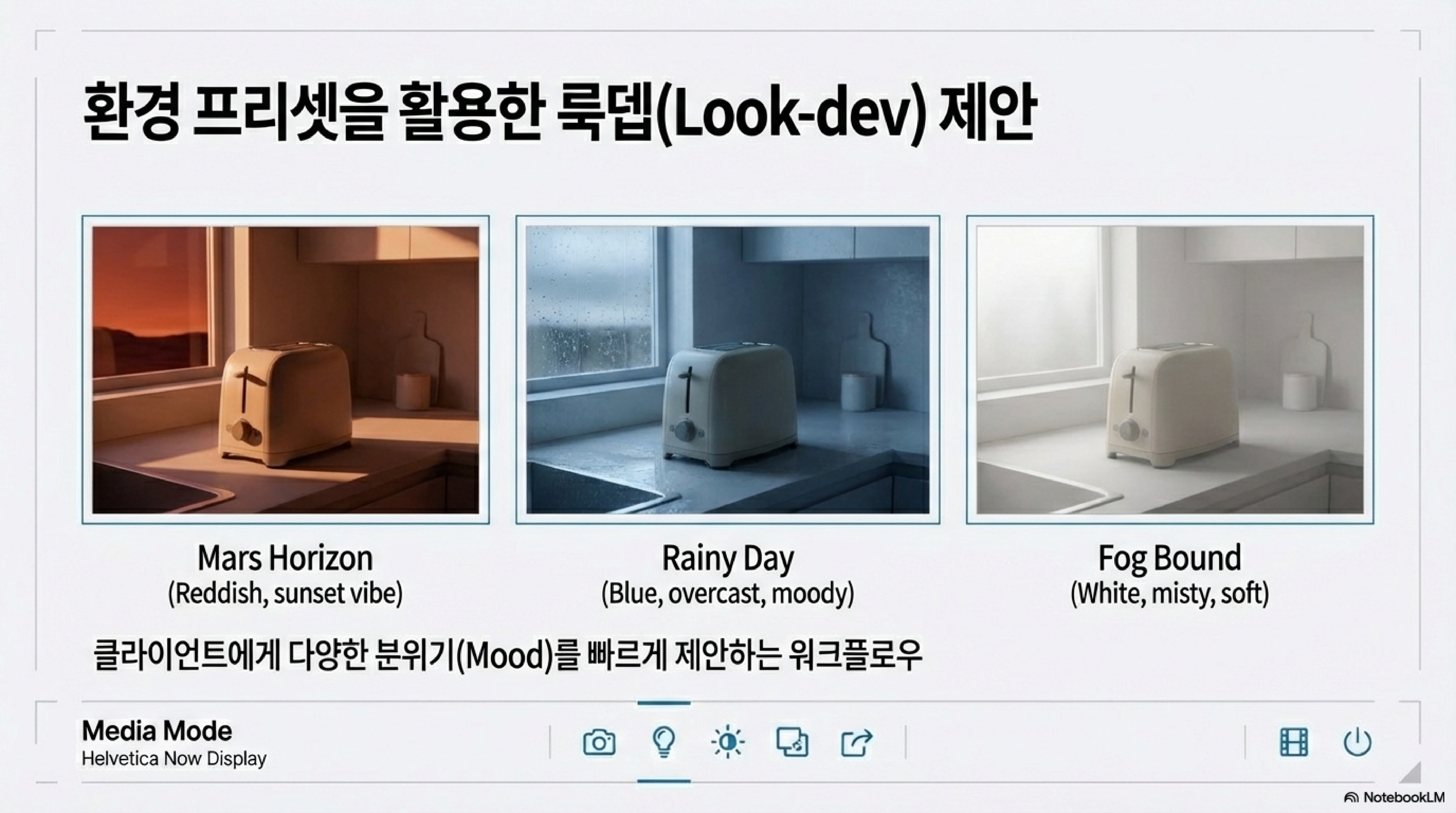 • 룩뎁(Look-dev): Mars Horizon, Rainy Day, Fog Bound 등 환경 프리셋을 활용하여 다양한 분위기의 시안을 신속하게 테스트합니다.