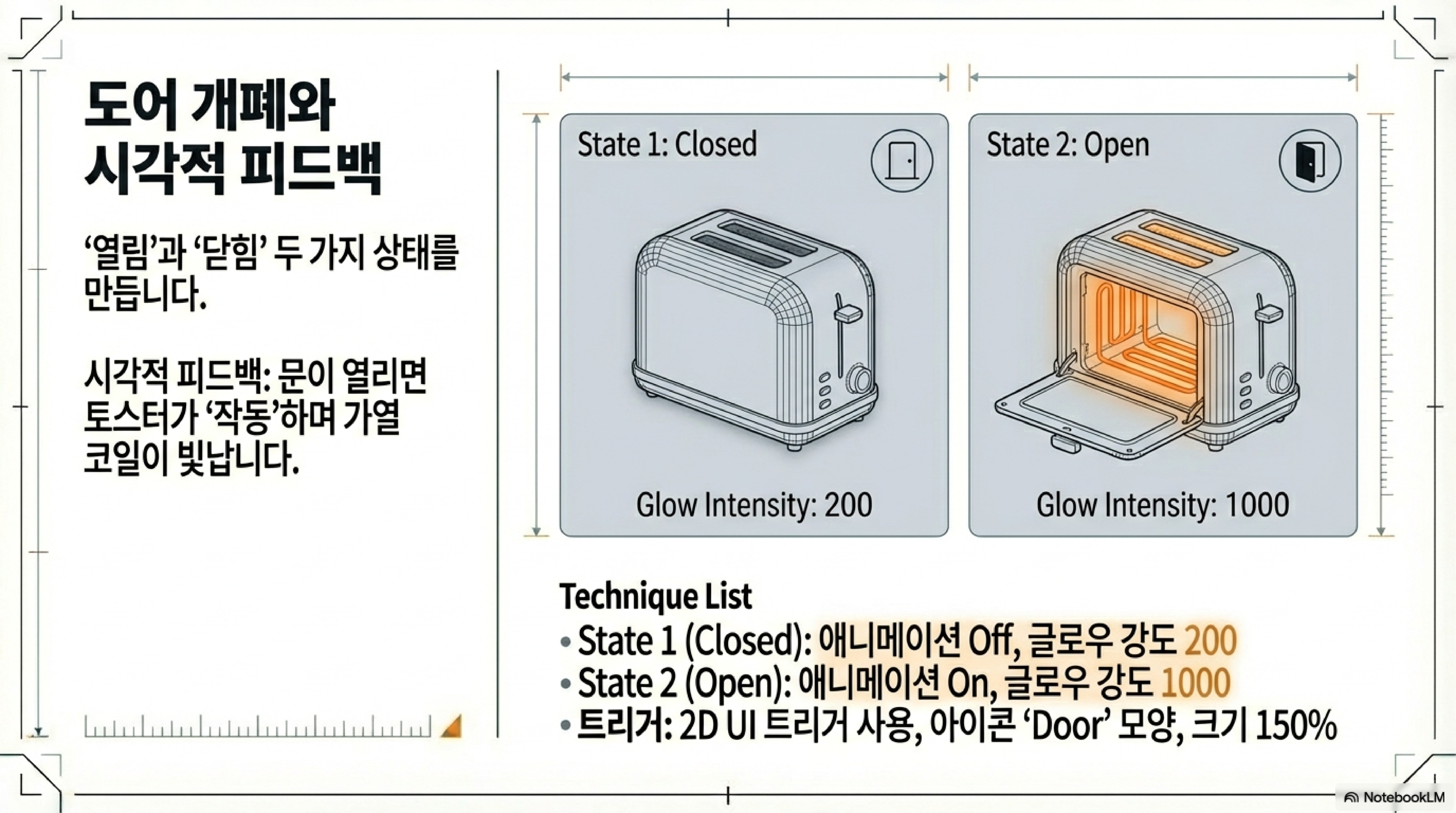 | 도어 개폐 | 애니메이션 재생 여부, 내부 열선 Glow 값(200~1000) 조절 | 문이 열리며 내부 가열 상태 표현 |