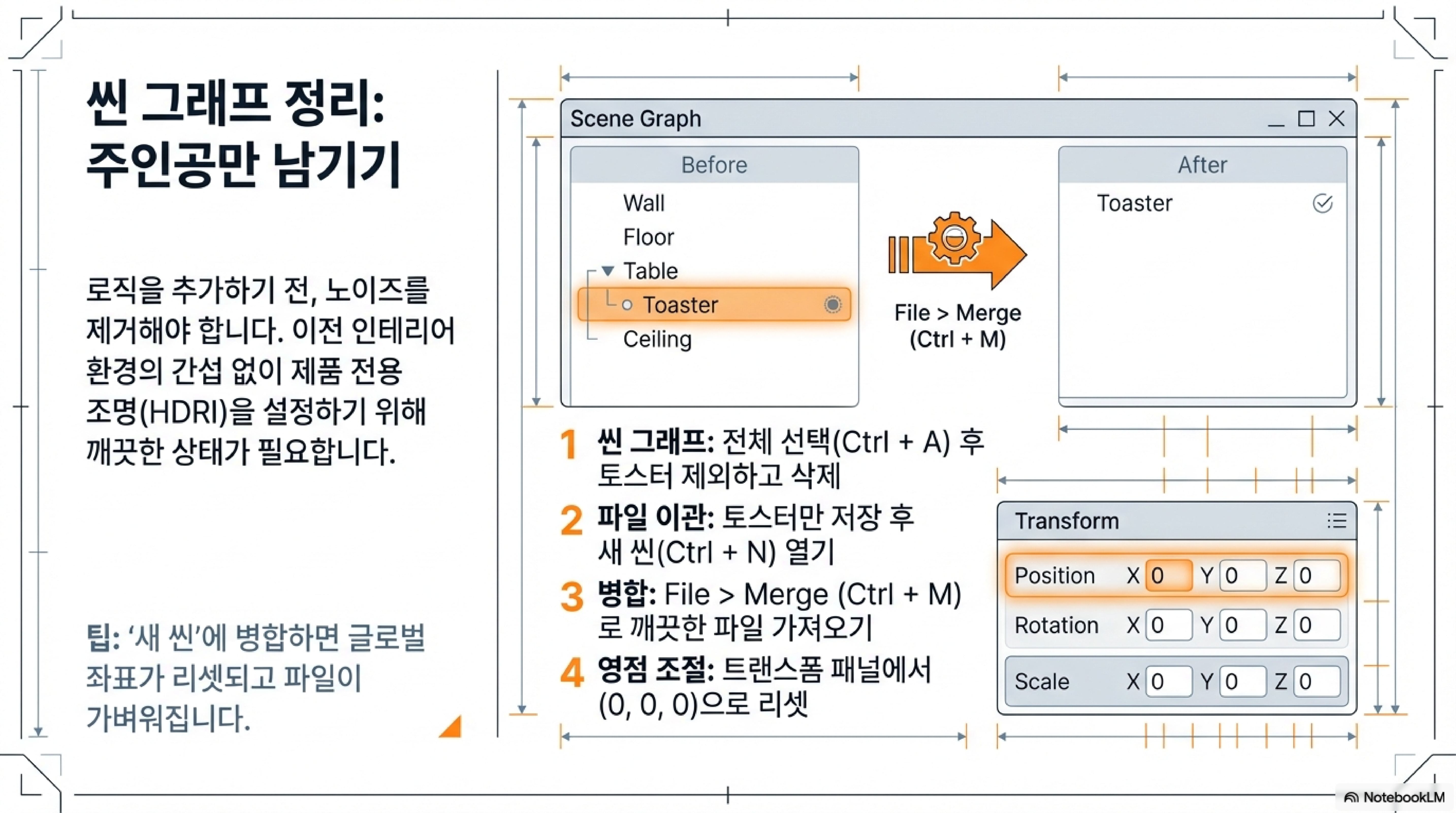 - 신규 씬 병합(Merge): 정제된 제품 모델을 새 씬으로 가져와 제품 전용 HDRI 환경을 독립적으로 세팅할 수 있는 환경을 조성합니다.