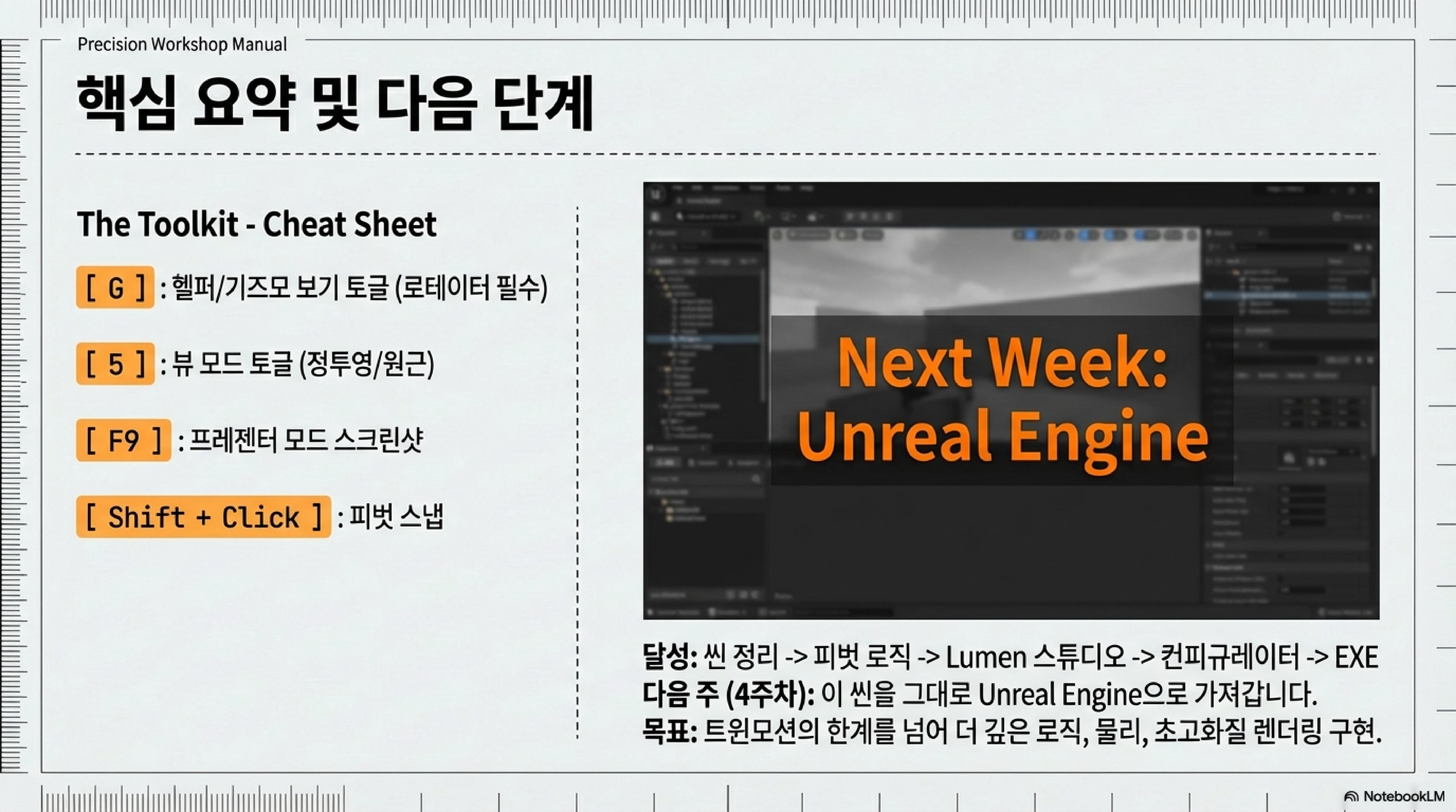 본 가이드는 트윈모션을 활용한 제품 시각화의 전 과정을 체계적으로 다루고 있습니다. 씬 최적화부터 컨피규레이터 구축, 그리고 프레젠터 배포에 이르는 일련의 과정은 제품 시각화 전문가가 반드시 숙지해야 할 핵심 역량입니다. 향후 과정에서는 이러한 트윈모션 씬을 **언리얼 엔진(Unreal Engine)**으로 이관하여 더욱 고도화된 인터랙티브 경험을 구축하는 단계로 확장될 예정입니다.