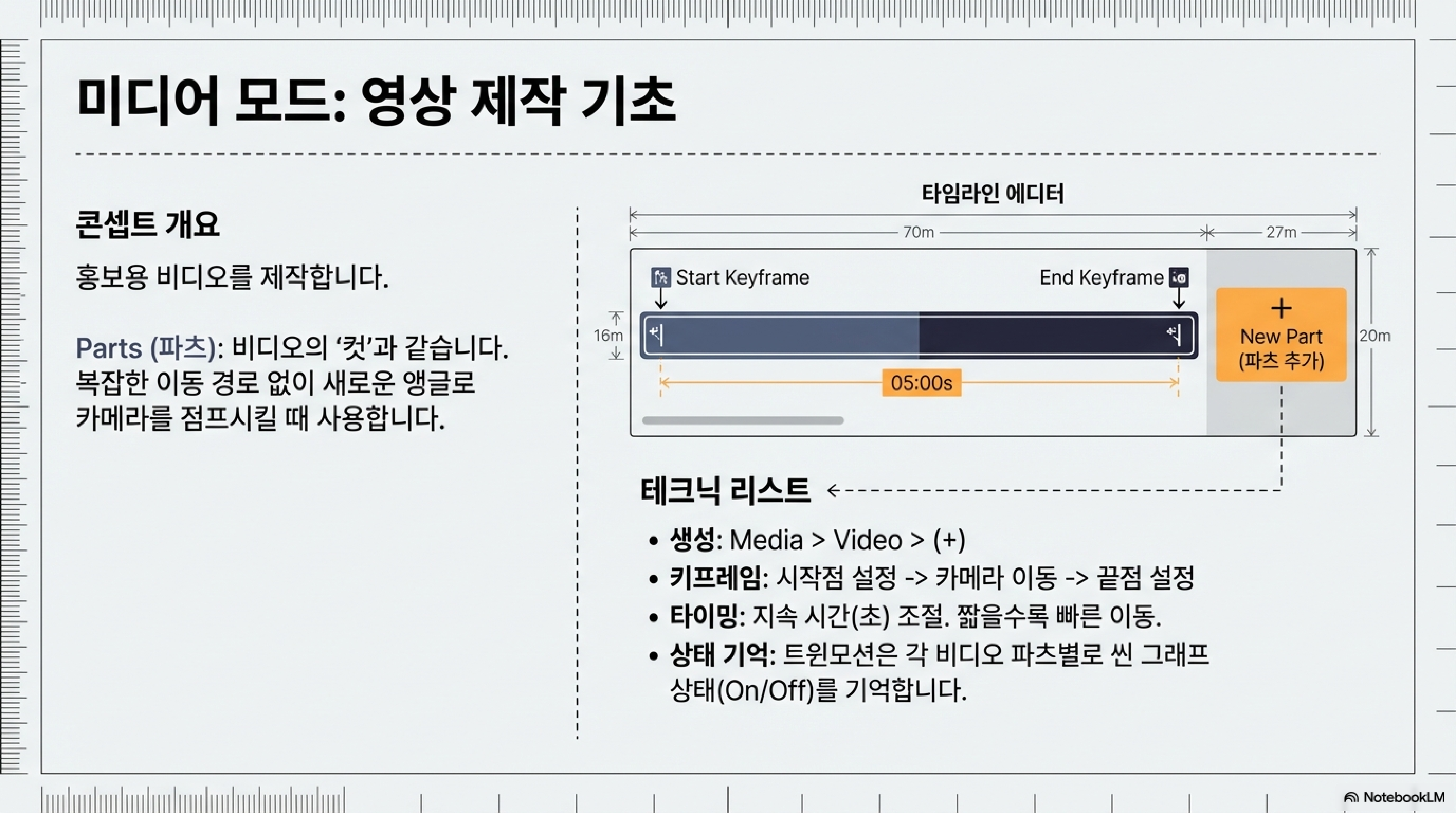 - 키프레임 방식: 시작점과 끝점의 카메라 위치를 지정하여 부드러운 이동 경로를 생성합니다.