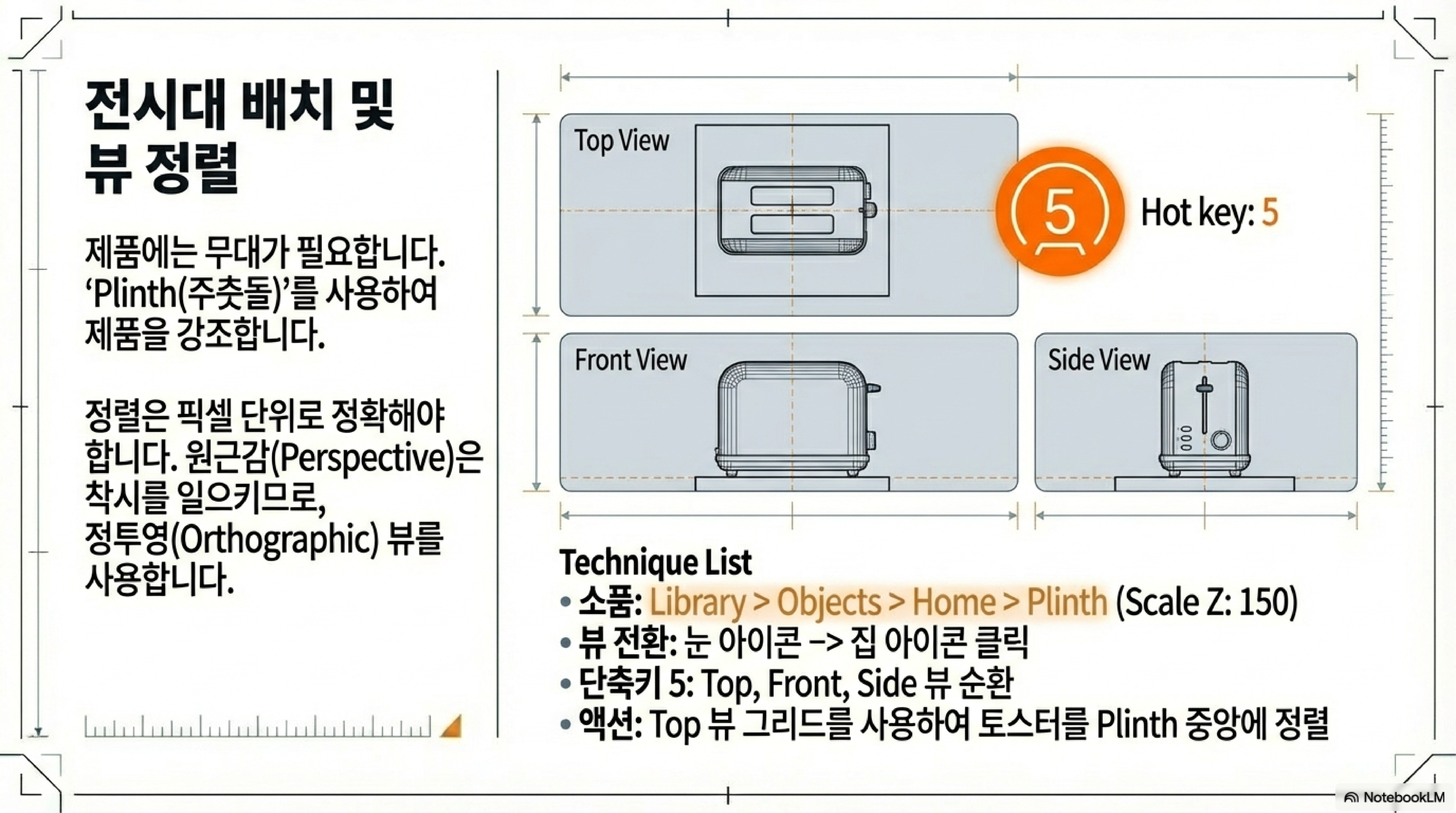 - 전시대(Plinth) 구성: 제품을 배치할 전용 구조물을 추가하고, 특수 뷰 모드(Top, Front, Side)를 통해 제품이 지면에 정확히 안착했는지 확인합니다.