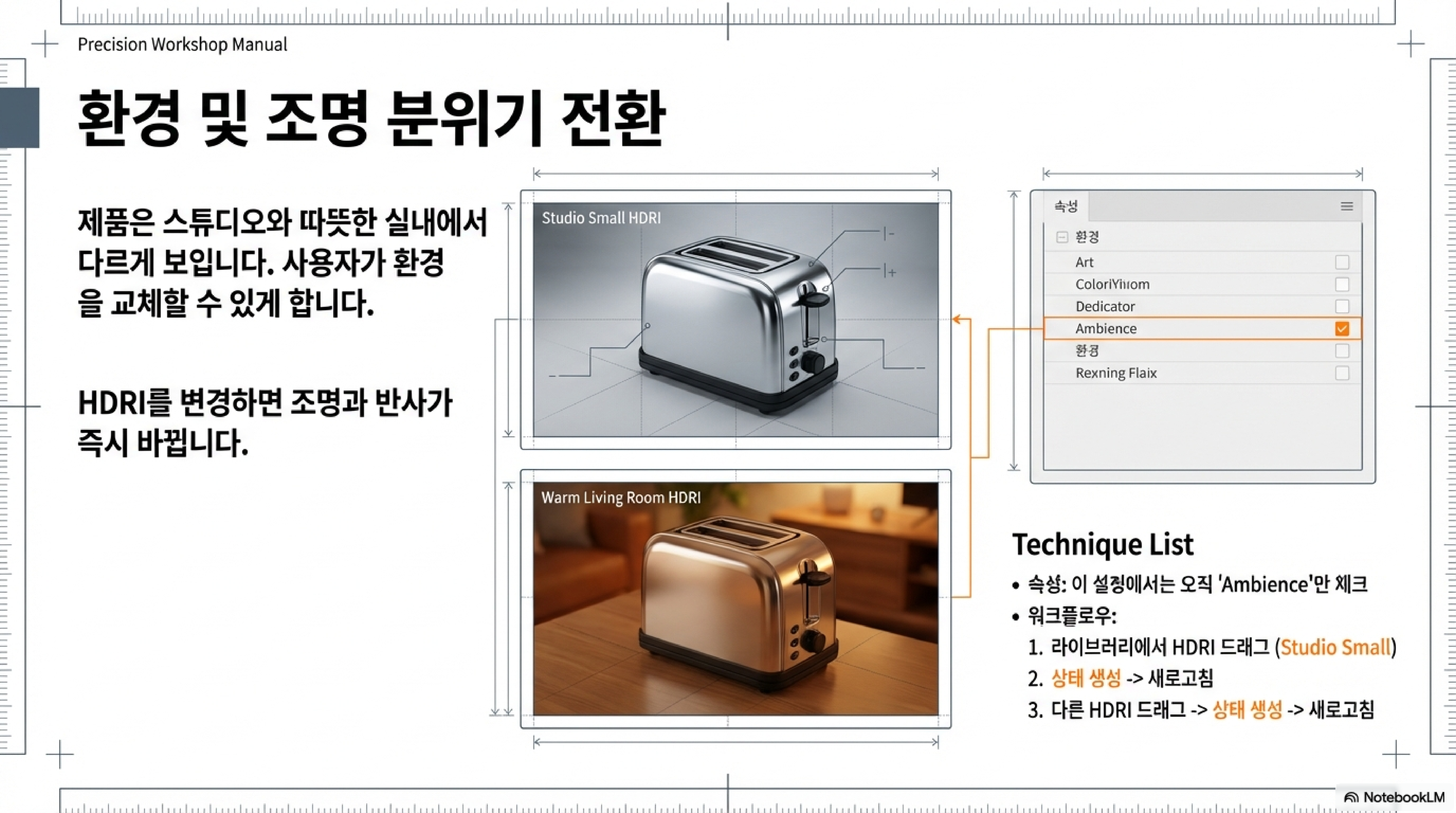 환경(HDRI) 다양한 HDRI 맵 교체 및 라이팅 정보 업데이트 스튜디오 분위기 및 제품 반사 느낌 전환