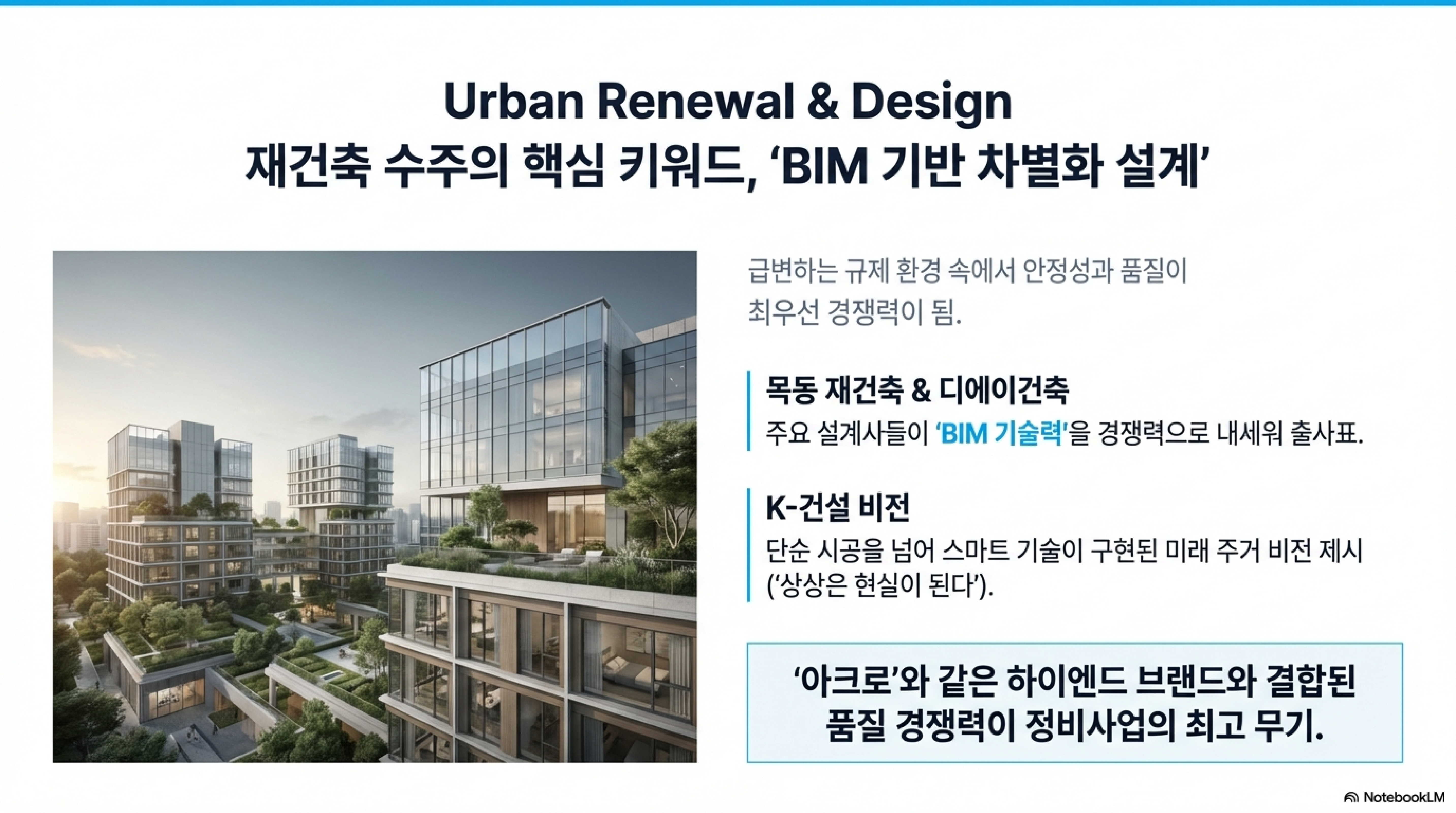 기술 도입 속도가 빨라지면서, 기존 수작업 중심의 프로세스를 고집하는 기업들은 수주 경쟁력에서 급격히 밀려나고 있습니다. 특히 정비사업에서도 BIM 설계 역량이 품질 차별화의 핵심 무기가 되고 있어요.
