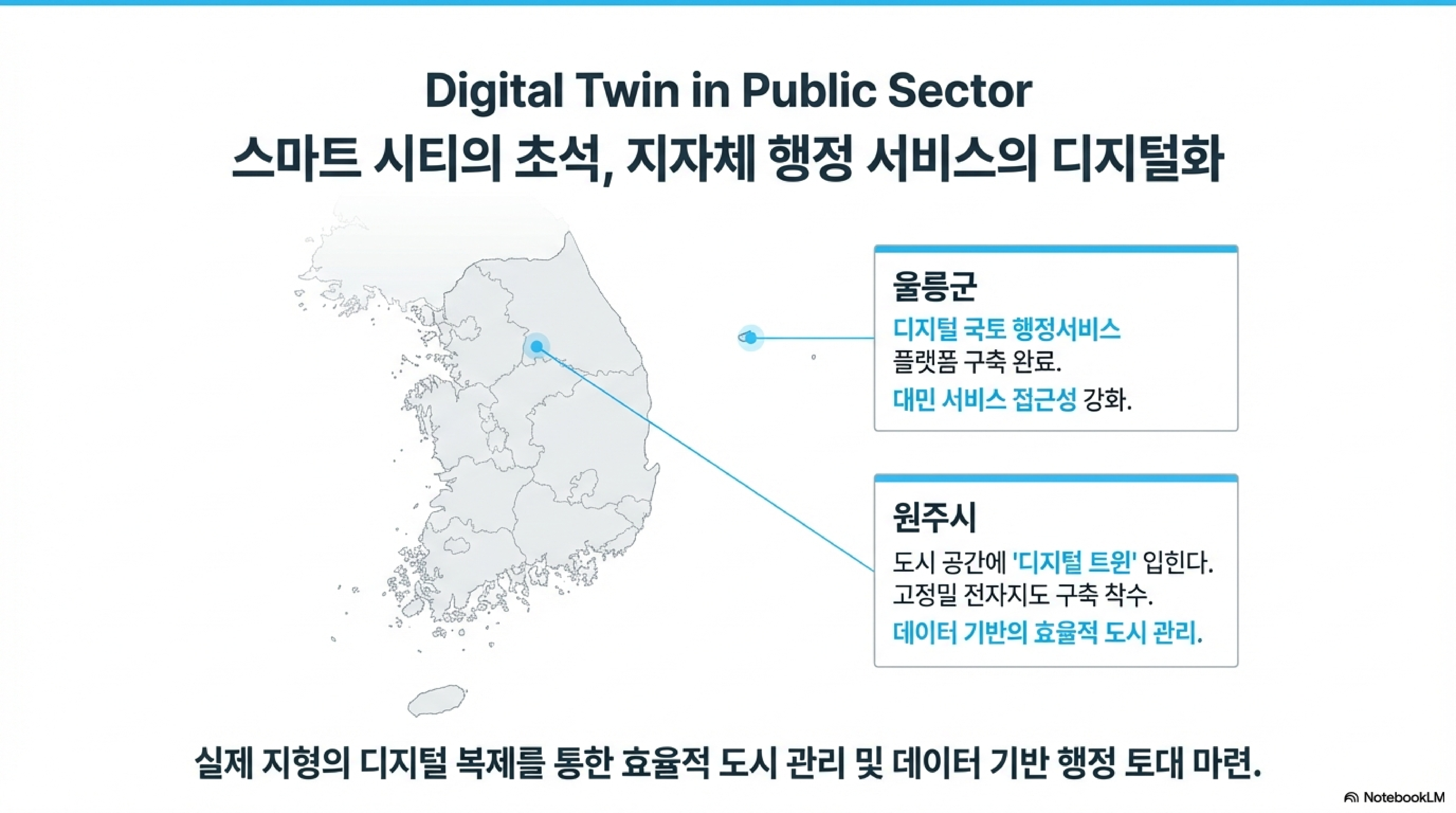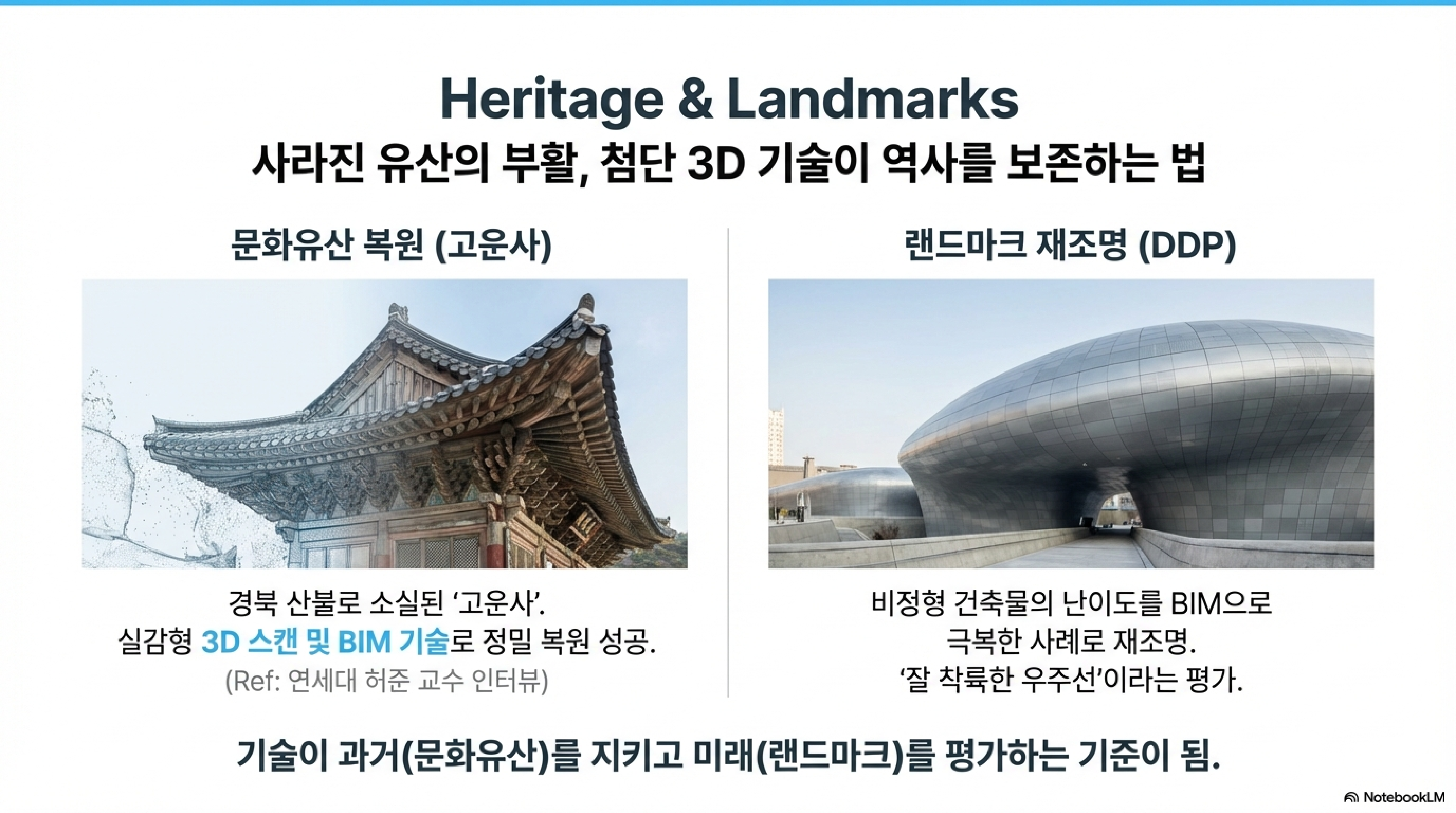 스마트 건설 기술은 단순히 이익을 내는 데만 쓰이지 않습니다. 울릉군과 원주시 등 지자체에서는 **디지털 트윈** 플랫폼을 구축해 국토 행정의 효율을 높이고 있고, 특히 산불로 소실된 전통 사찰 등을 3D 스캔과 BIM으로 정밀 복원하는 등 문화재 보존에도 큰 공을 세우고 있어요.