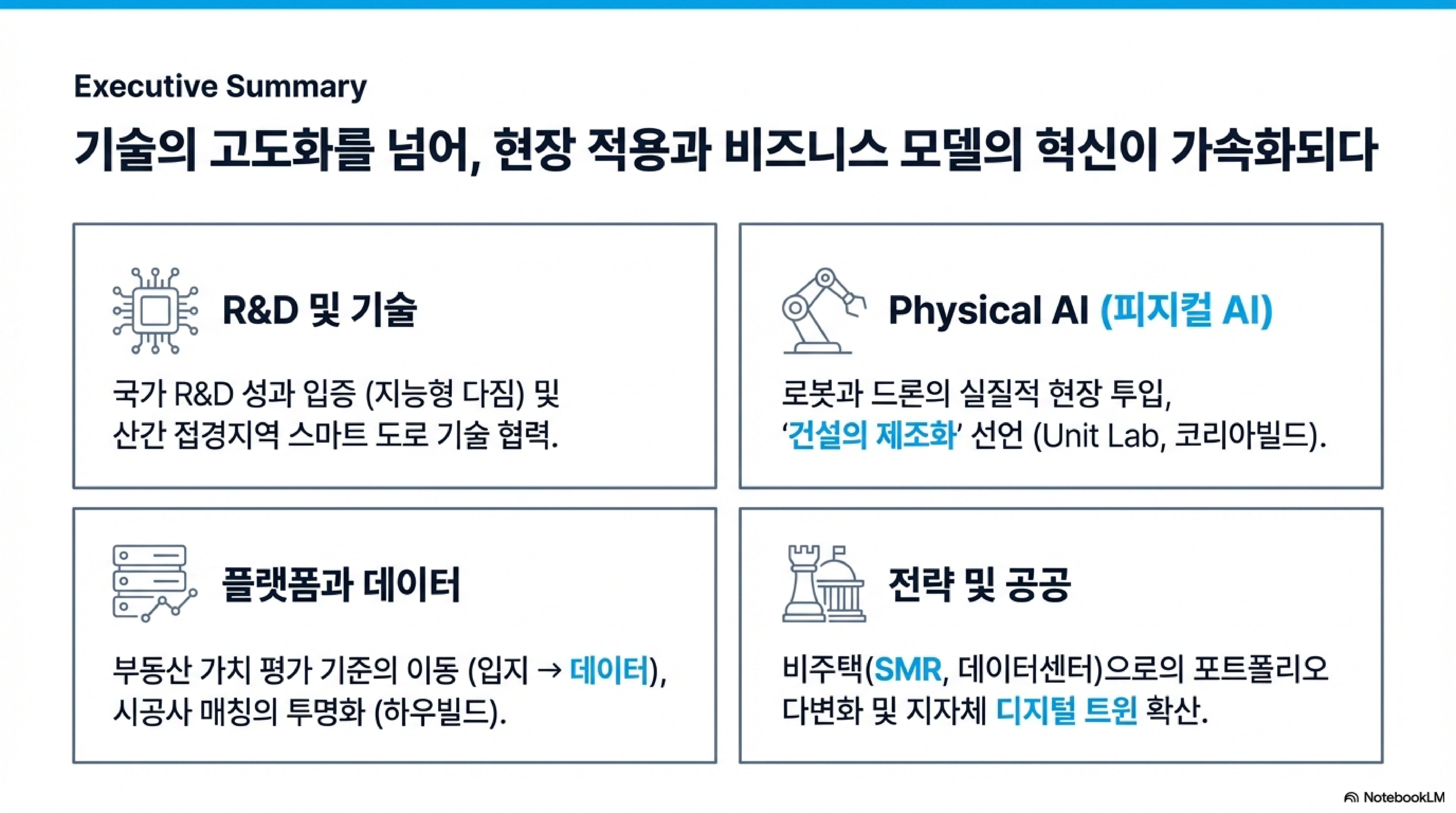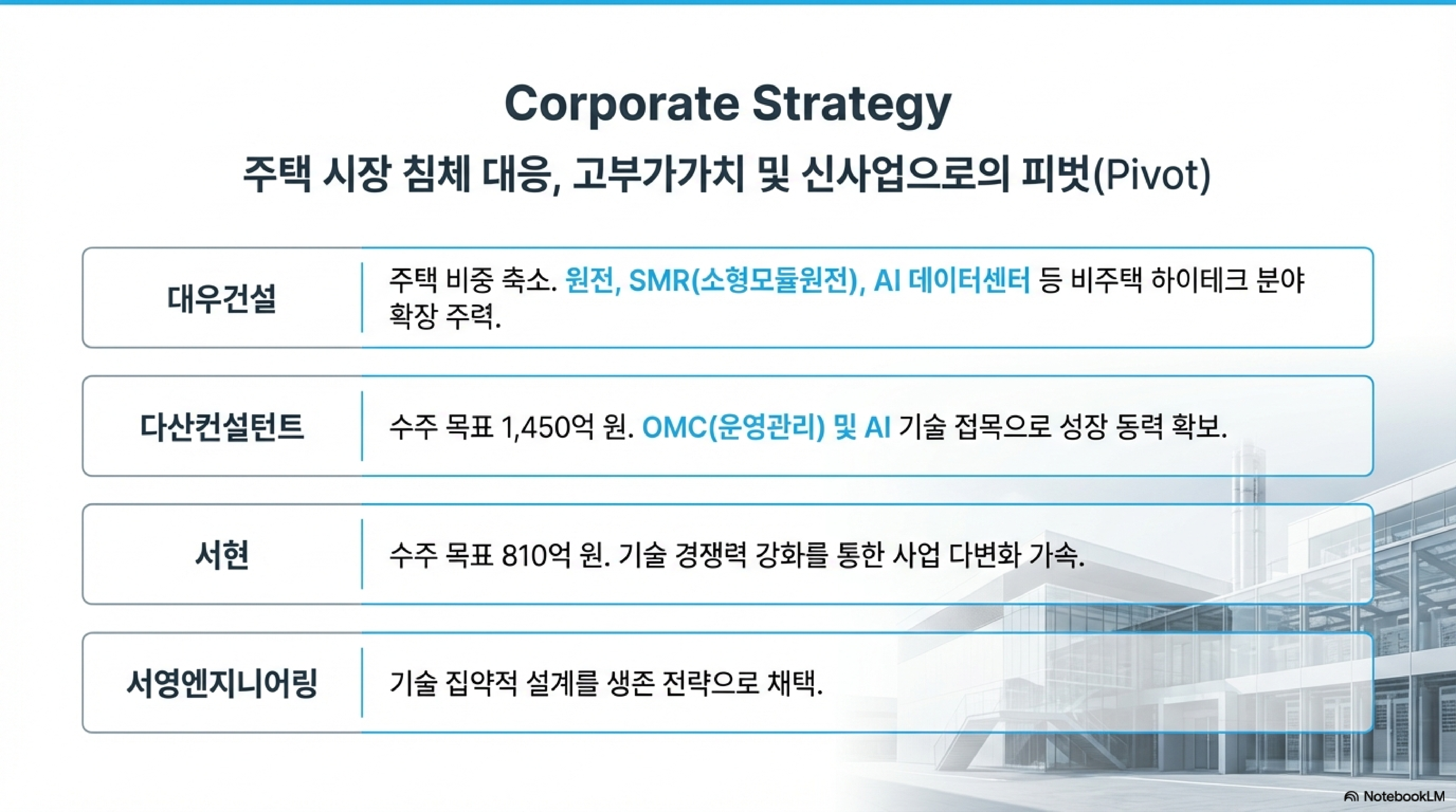 건설사들의 포트폴리오에도 큰 변화가 생겼습니다. 주택 경기의 불확실성을 극복하기 위해 **SMR(소형모듈원전)**, **AI 데이터 센터**, 그리고 **OMC(운영 및 유지관리)** 등 기술 집약적인 분야로 눈을 돌리고 있습니다.