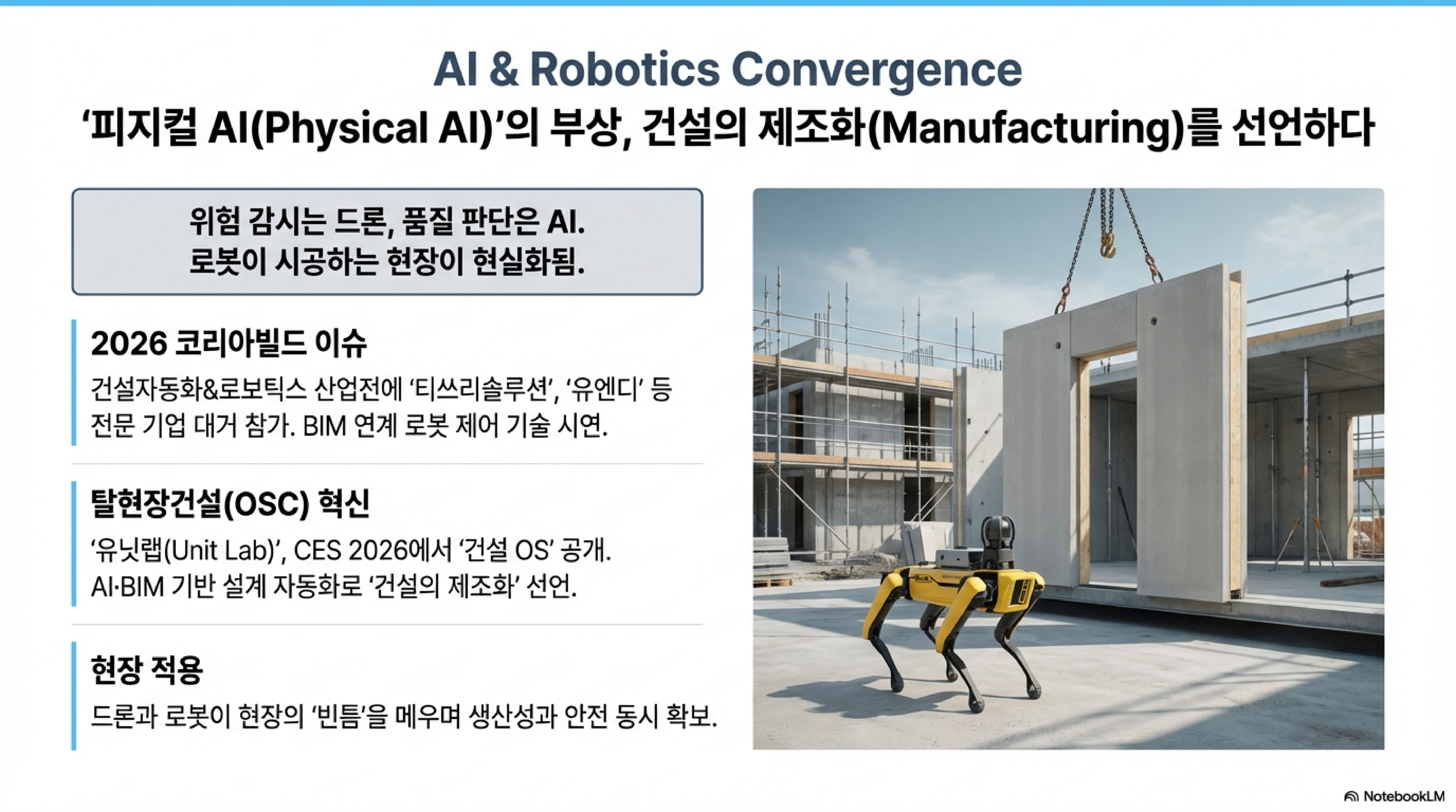 최근 열린 CES 2026에서 유닛랩이 공개한 'AI 및 BIM 기반 건설 OS(운영체제)'는 큰 충격을 주었습니다. 이제 건설을 '현장에서 짓는 것'이 아니라 '공장에서 제조하여 조립하는 것'으로 정의하기 시작한 거죠.