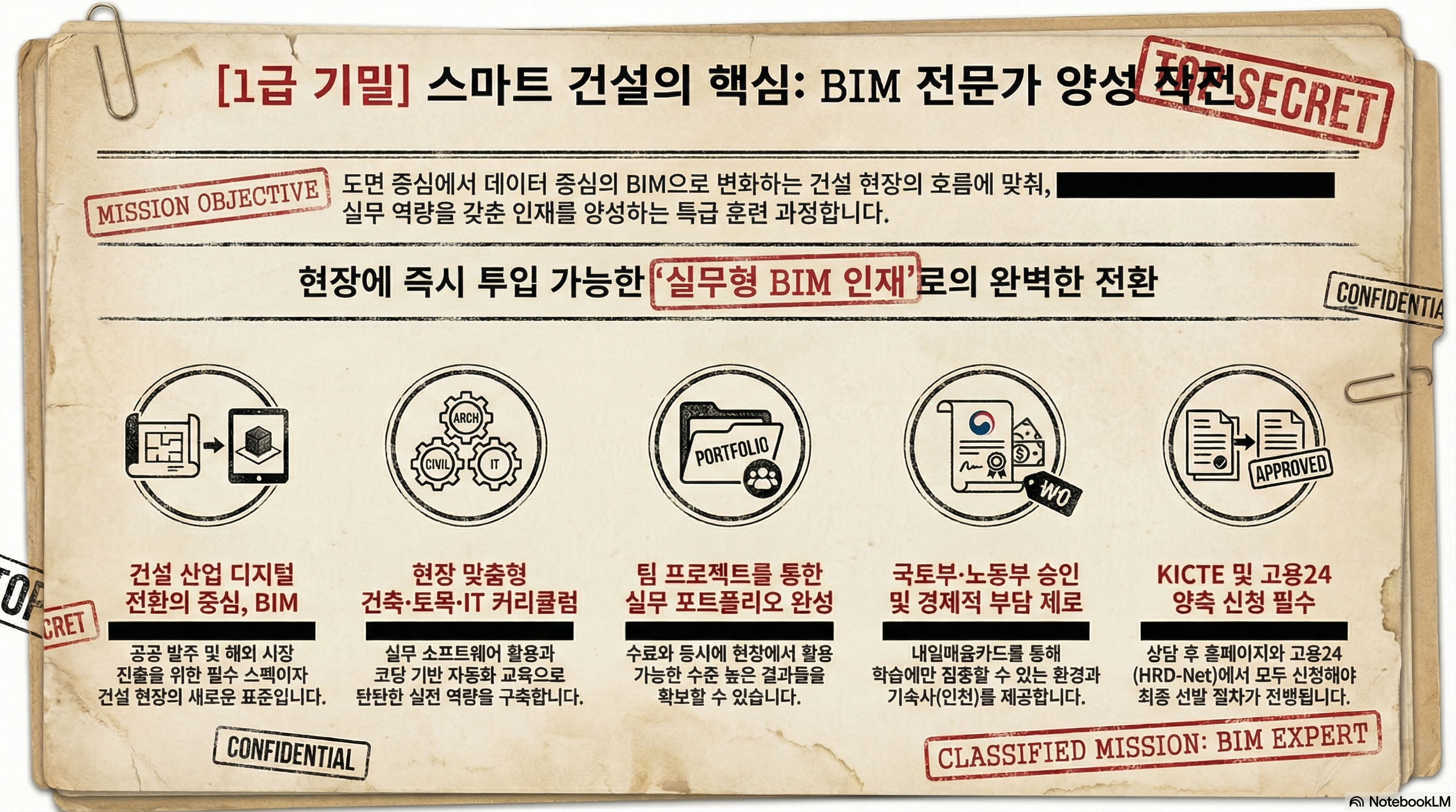 본 보고서는 건설기술교육원(KICTE)의 BIM 교육 체계를 분석하여, 건설 기술자들이 디지털 전환 환경에 적응하고 실무 전문가로 거듭나기 위한 전략적 경로를 제시한다. 주요 요점은 현장 중심의 실무 커리큘럼, 국토교통부 및 노동부의 정책적 지원, 그리고 체계적인 교육 참여 프로세스를 통한 실무형 포트폴리오 구축에 있다.
