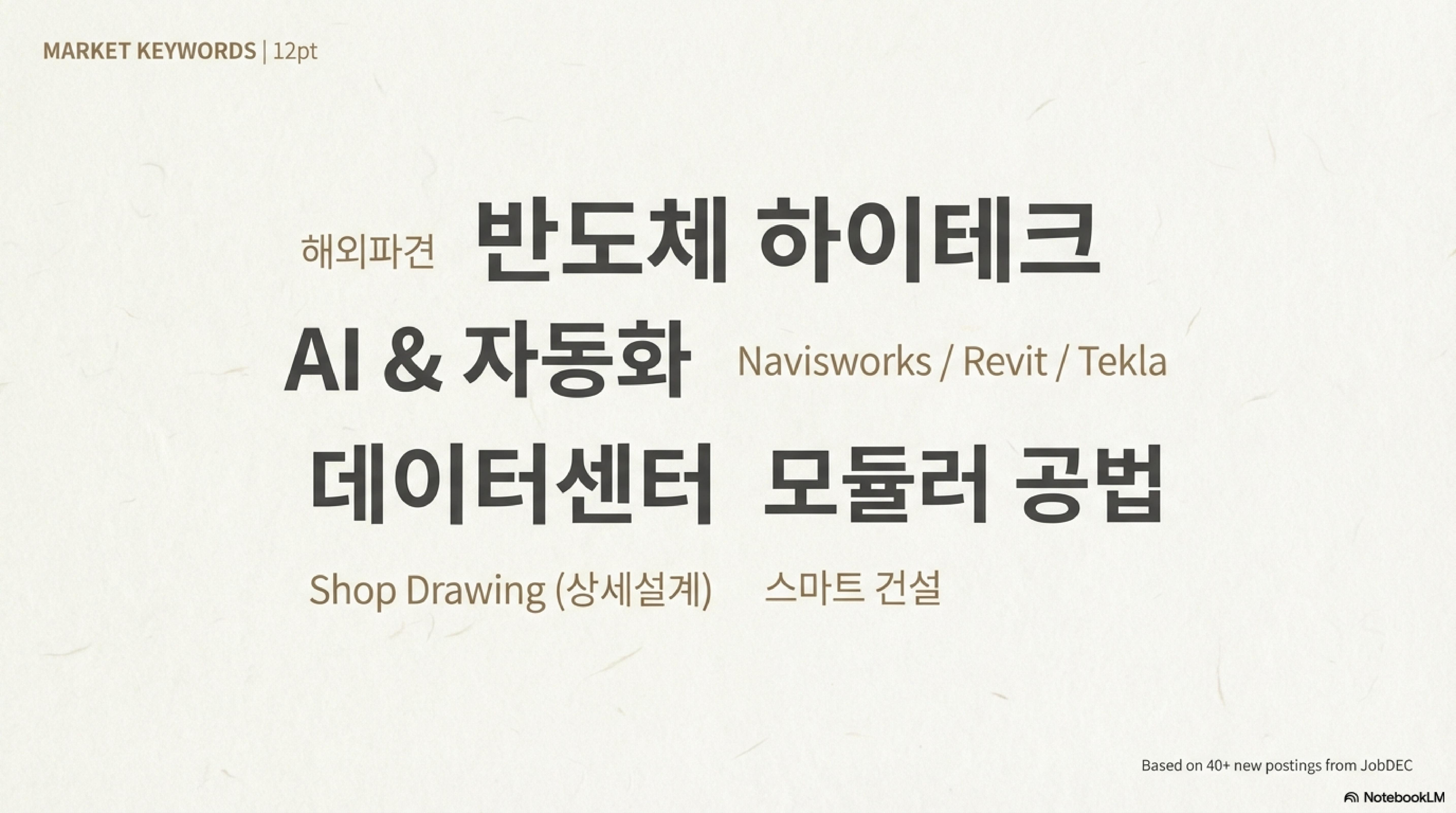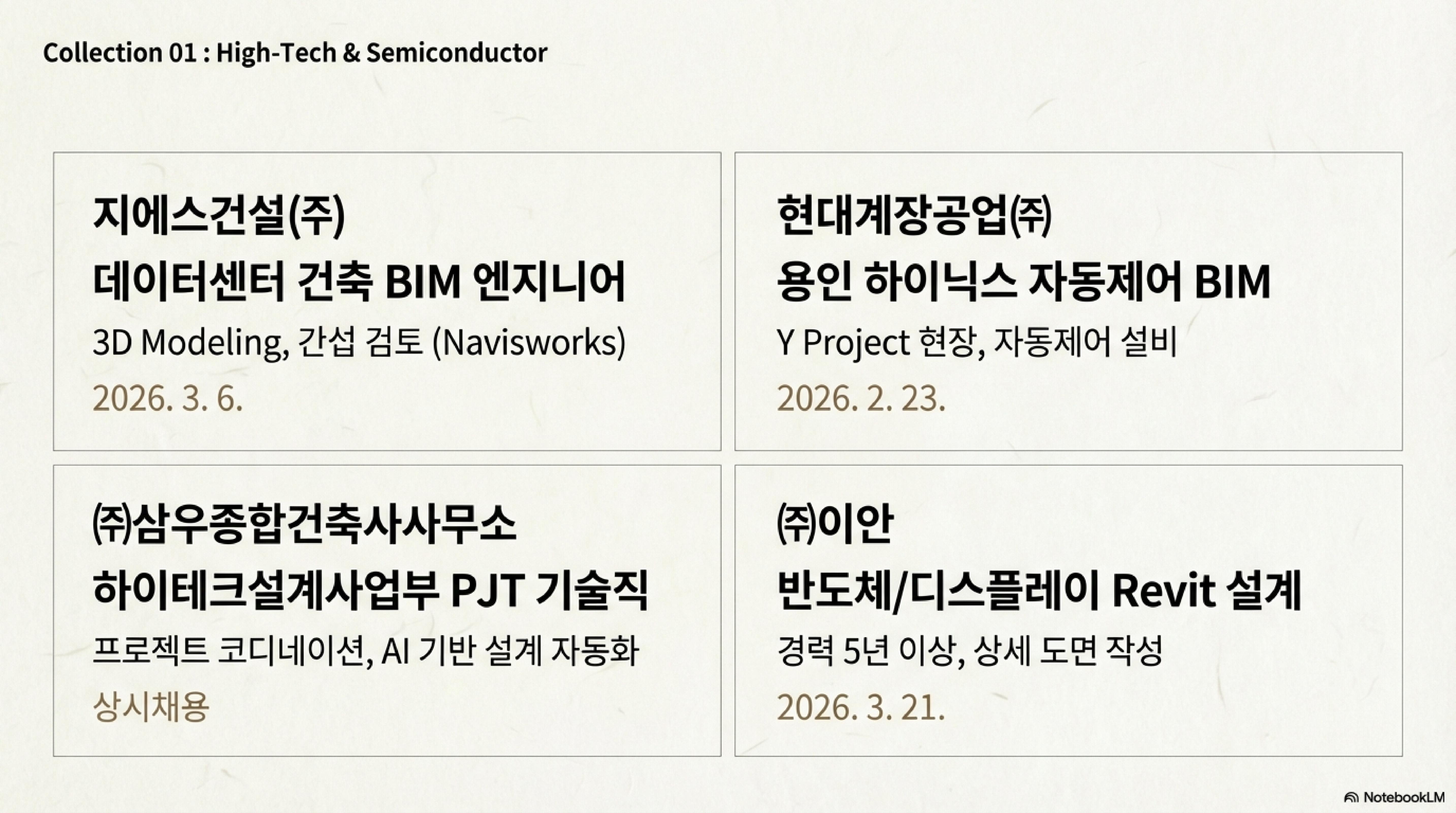 하이테크 분야에서는 Revit뿐만 아니라 Tekla Structures 활용 능력도 매우 높게 평가받습니다. 철골이나 복잡한 기계 설비 모델링 경험이 있다면 강력한 무기가 될 거예요.
