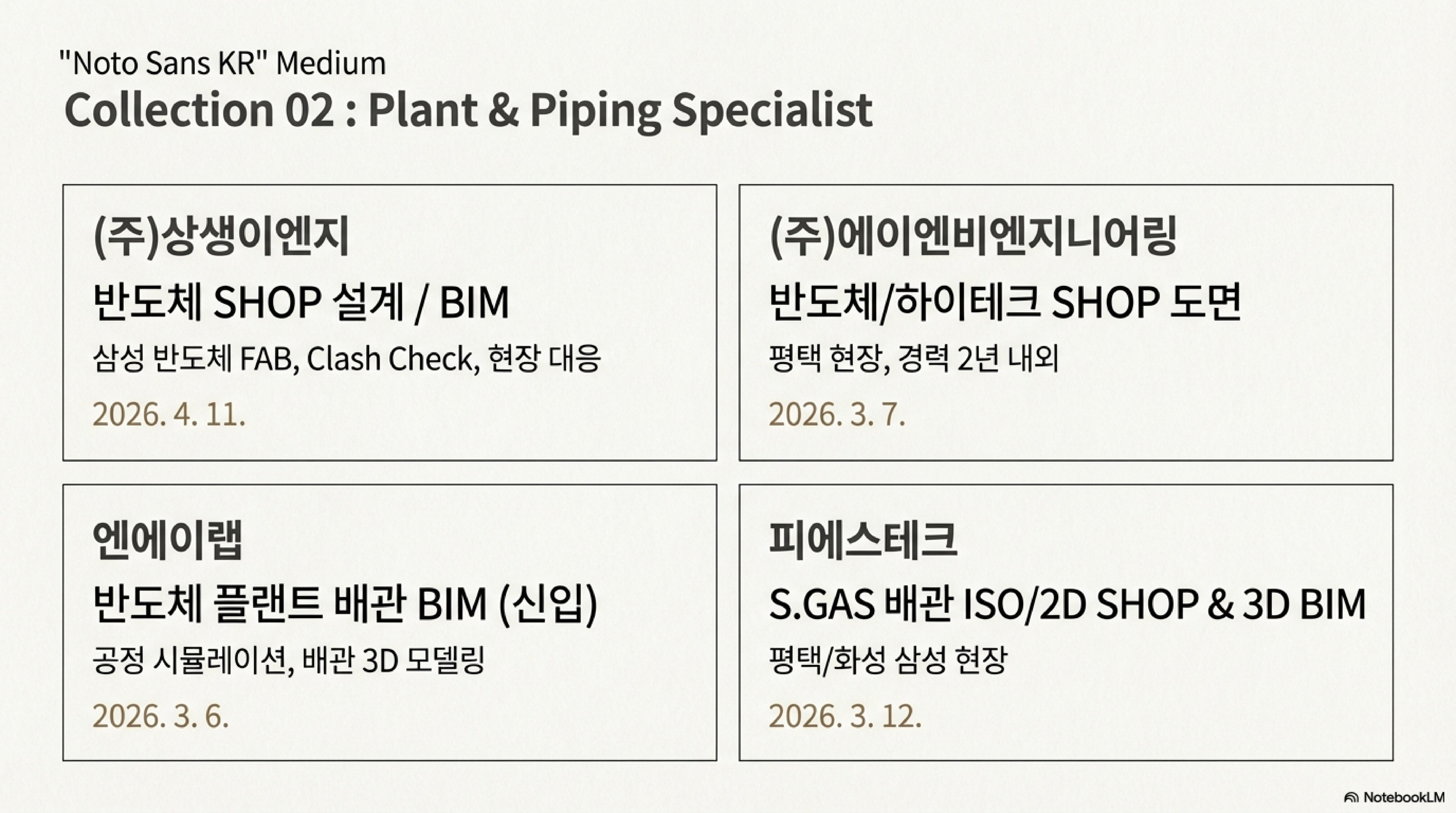 특히 상생이엔지나 에이엔비엔지니어링 같은 전문 기업들이 삼성물산이나 삼성전자 현장에 대응하기 위해 현장 밀착형 엔지니어를 적극적으로 찾고 있어요. 단순 모델링이 아니라 간섭 검토(Clash Detection)를 통해 시공 오차를 줄이는 실질적인 역량이 가장 중요해 보입니다.