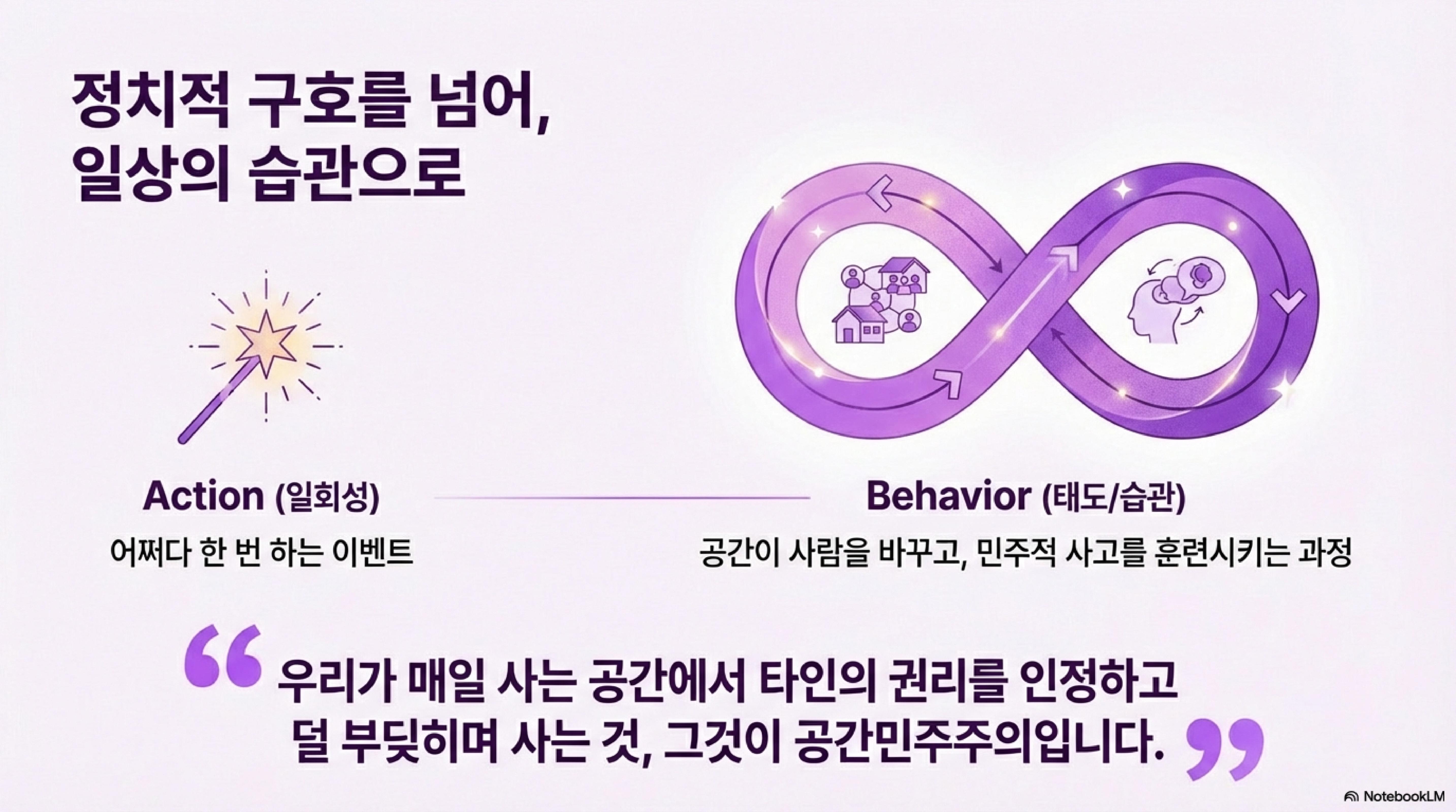 "공간 민주주의는 내가 갖는 권리만큼 너도 갖고 있다는 것을 인정하고 함께 쓰는 훈련입니다."
