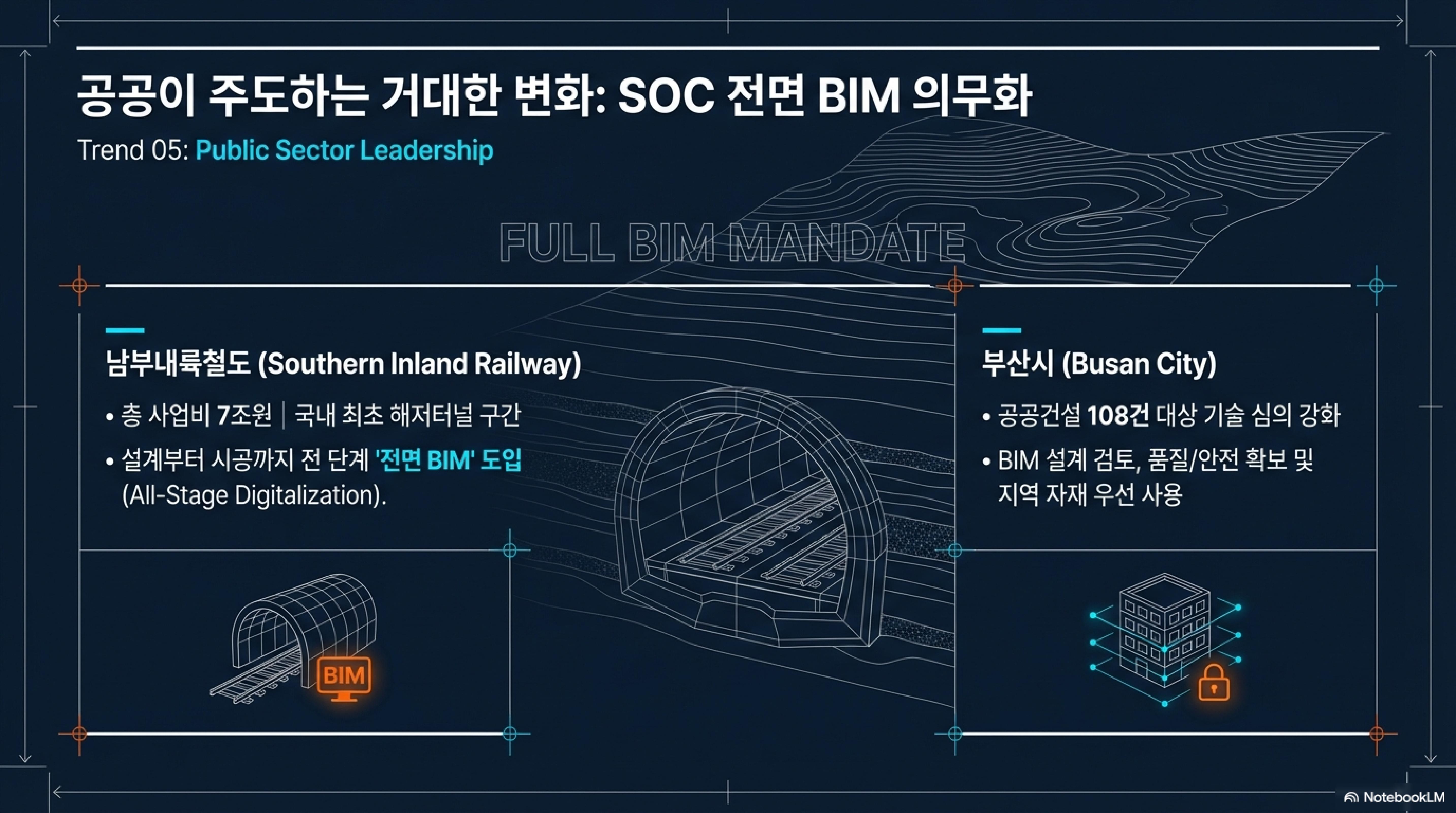 국가 대형 프로젝트에도 BIM이 '전면' 도입되고 있습니다. 특히 부산광역시와 남부내륙철도 소식이 뜨거운데요. 부산시는 벡스코 제3전시장 등 주요 공공건설 기술심의에 BIM을 적극 활용하고 있으며, 남부내륙철도는 국내 최초 해저터널 구간을 포함한 전 구간에 전면 BIM을 도입해 기술 혁신을 선도하고 있습니다.