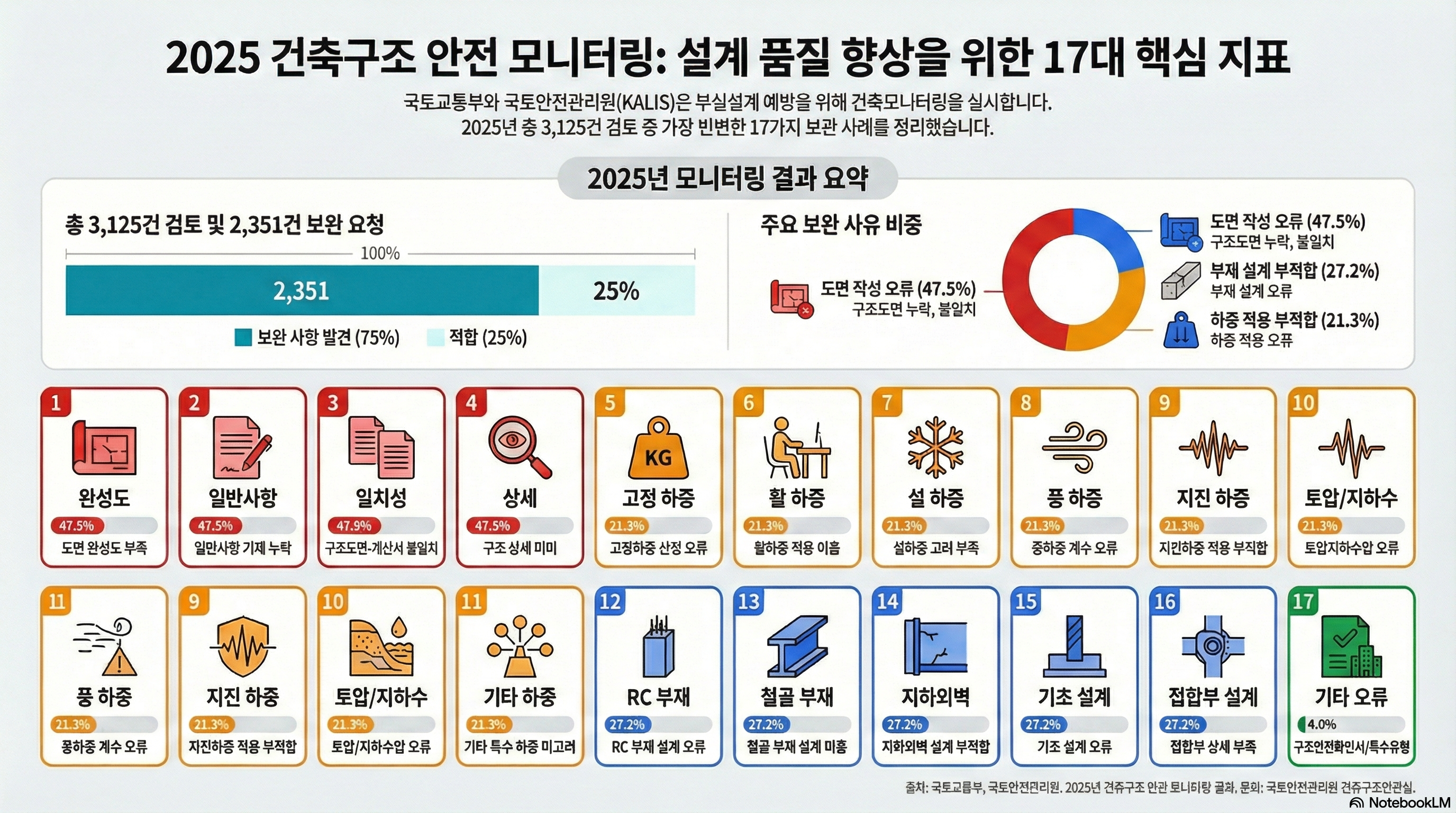 본 문서는 국토교통부와 국토안전관리원(KALIS)이 실시한 '2025년 건축안전 모니터링(구조분야)' 결과를 바탕으로, 건축물의 부실 설계 및 안전사고 예방을 위해 작성되었습니다. 3,125건의 검토 결과를 분석하여 빈번하게 발생하는 오류와 보완 사례를 공유함으로써 인허가 담당자 및 관계 전문가(건축사, 건축구조기술사 등)의 검토 수준과 기술 능력을 향상시키는 데 목적이 있습니다.