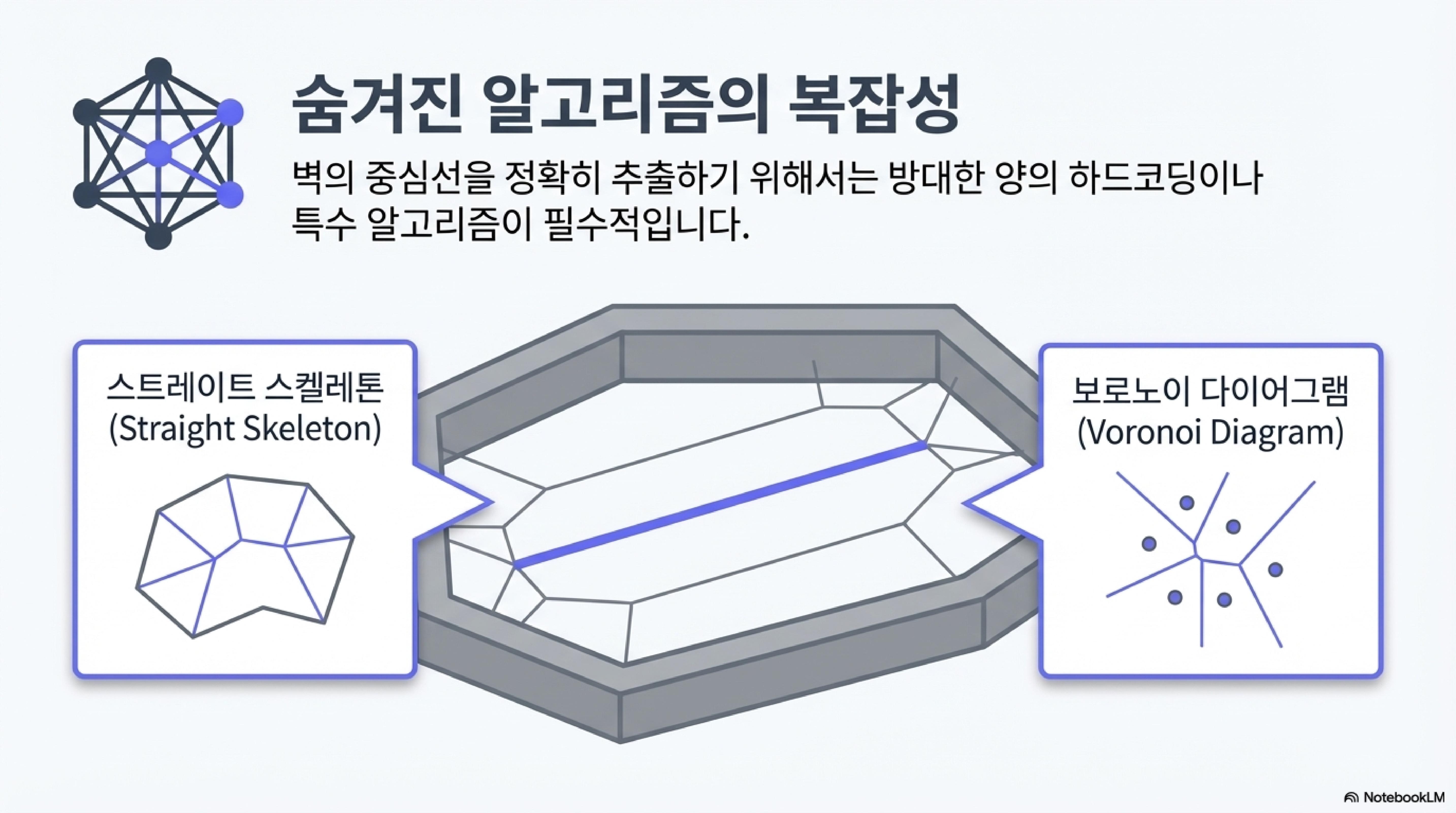 - 필요 알고리즘: 벽 중심선 추출을 위해 스트레이트 스켈레톤(Straight Skeleton), 보로노이(Voronoi), 샌(SAN) 등의 알고리즘이 필요하다.